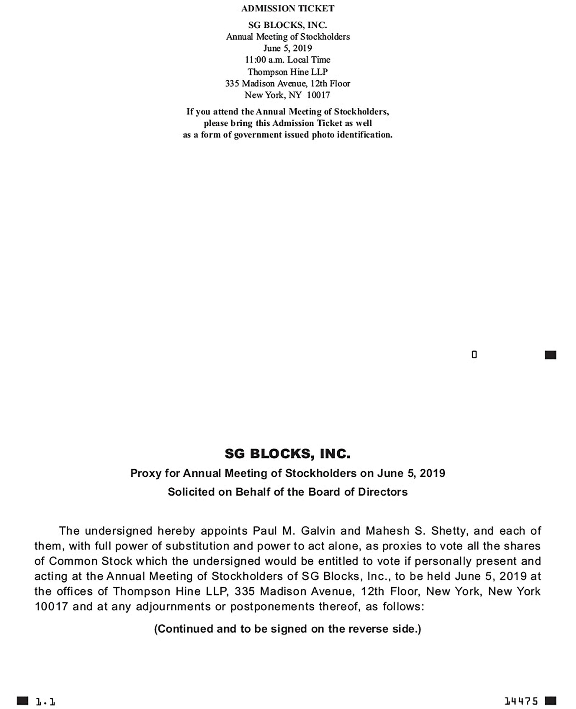 This proxy statement is being furnished to you in connection with the solicitation of proxies by the Board of Directors (the “Board”) of SG Blocks, Inc. (the “Company,” “we,” “us” or “our”). The 2019 Annual Meeting of Stockholders (the “Annual Meeting”) will be held on Wednesday, June 5, 2019, at 11:00 a.m., local time, at the offices of Thompson Hine LLP (“Thompson Hine”), 335 Madison Avenue, 12th Floor, New York, New York 10017. The Company’s telephone number is (646) 240-4235.
