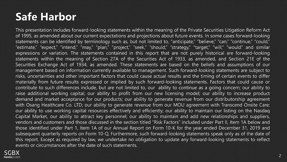 2 Safe Harbor This presentation includes forward - looking statements within the meaning of the Private Securities Litigation Reform Act of 1995 , as amended about our current expectations and projections about future events . In some cases forward - looking statements can be identified by terminology such as, but not limited to, “anticipate,” “believe,” “can,” “continue,” “could,” “estimate,” “expect,” “intend,” “may,” “plan,” “project,” “seek,” “should,” “strategy,” “target,” “will,” “would” and similar expressions or variation . The statements contained in this report that are not purely historical are forward - looking statements within the meaning of Section 27 A of the Securities Act of 1933 , as amended, and Section 21 E of the Securities Exchange Act of 1934 , as amended . These statements are based on the beliefs and assumptions of our management based on information currently available to management . Such forward - looking statements are subject to risks, uncertainties and other important factors that could cause actual results and the timing of certain events to differ materially from future results expressed or implied by such forward - looking statements . Factors that could cause or contribute to such differences include, but are not limited to, our ability to continue as a going concern ; our ability to raise additional working capital ; our ability to profit from our new licensing model ; our ability to increase product demand and market acceptance for our products ; our ability to generate revenue from our distributorship agreement with Osang Healthcare Co . LTD ; our ability to generate revenue from our MOU agreement with Transcend Onsite Care ; our ability to use working capital resources effectively and efficiently ; our ability to maintain our listing on the Nasdaq Capital Market, our ability to attract key personnel ; our ability to maintain and add new relationships and suppliers, vendors and customers and those discussed in the section titled “Risk Factors” included under Part II, Item 1 A below and those identified under Part 1 , Item 1 A of our Annual Report on Form 10 - K for the year ended December 31 , 2019 and subsequent quarterly reports on Form 10 - Q . Furthermore, such forward - looking statements speak only as of the date of this report . Except as required by law, we undertake no obligation to update any forward - looking statements to reflect events or circumstances after the date of such statements .