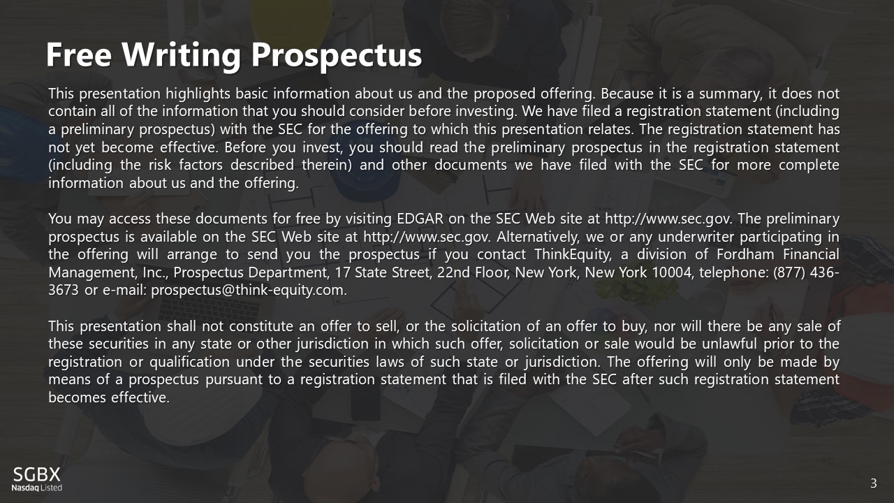 Free Writing Prospectus 3 This presentation highlights basic information about us and the proposed offering . Because it is a summary, it does not contain all of the information that you should consider before investing . We have filed a registration statement (including a preliminary prospectus) with the SEC for the offering to which this presentation relates . The registration statement has not yet become effective . Before you invest, you should read the preliminary prospectus in the registration statement (including the risk factors described therein) and other documents we have filed with the SEC for more complete information about us and the offering . You may access these documents for free by visiting EDGAR on the SEC Web site at http : //www . sec . gov . The preliminary prospectus is available on the SEC Web site at http : //www . sec . gov . Alternatively, we or any underwriter participating in the offering will arrange to send you the prospectus if you contact ThinkEquity, a division of Fordham Financial Management, Inc . , Prospectus Department, 17 State Street, 22 nd Floor, New York, New York 10004 , telephone : ( 877 ) 436 - 3673 or e - mail : prospectus@think - equity . com . This presentation shall not constitute an offer to sell, or the solicitation of an offer to buy, nor will there be any sale of these securities in any state or other jurisdiction in which such offer, solicitation or sale would be unlawful prior to the registration or qualification under the securities laws of such state or jurisdiction . The offering will only be made by means of a prospectus pursuant to a registration statement that is filed with the SEC after such registration statement becomes effective .
