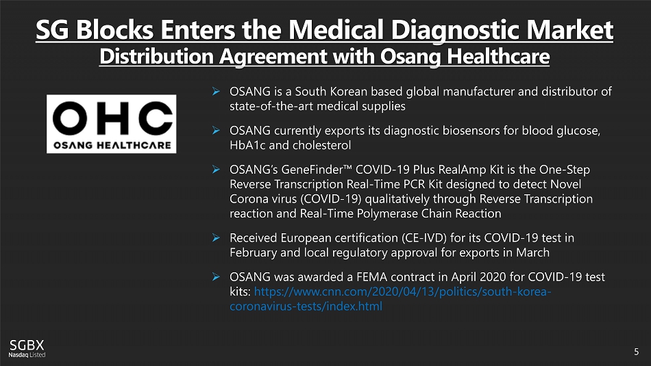 SG Blocks Enters the Medical Diagnostic Market Distribution Agreement with Osang Healthcare 5 » OSANG is a South Korean based global manufacturer and distributor of state - of - the - art medical supplies » OSANG currently exports its diagnostic biosensors for blood glucose, HbA1c and cholesterol » OSANG’s GeneFinder ™ COVID - 19 Plus RealAmp Kit is the One - Step Reverse Transcription Real - Time PCR Kit designed to detect Novel Corona virus (COVID - 19) qualitatively through Reverse Transcription reaction and Real - Time Polymerase Chain Reaction » Received European certification (CE - IVD) for its COVID - 19 test in February and local regulatory approval for exports in March » OSANG was a warded a FEMA contract in April 2020 for COVID - 19 test kits: https://www.cnn.com/2020/04/13/politics/south - korea - coronavirus - tests/index.html
