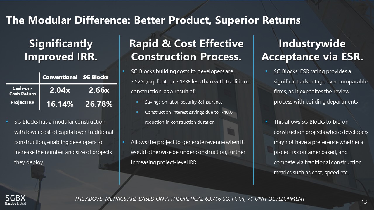 How SG Blocks Accelerates Construction 12 SITE DEVELOPMENT & FOUNDATIONS TRANSPORT / INSTALL / BUILD - UP DESIGN ARCHITECT PRELIMINARY DRAWINGS DETAIL/ CON S TRU C TION DRAWINGS BID SELECT CON S TRU C TION MANAGER SELE C T SUB - CONTRACTORS ENGINEER ENGINEER ARCHITE C T SG BLOCKS/ DESIGN ASSIST PERMITS & APPR O V A L S BUILDING F ABRI C A TION VALUE ENGINEERING CON S TRU C TION DRAWINGS PERMITS & APPR O V A L S BUDGET E S T ABLISHED SITE DEVELOPMENT & FOUNDATIONS RETURN TO DESIGN IF COSTS EXCEED BUDGETS (VE) PROJECT OVERRUNS CHANGE ORDERS WEATHER DELAYS MULTIPLE BIDS COMPARISONS / RE - BIDS DELAYS / RFIs BUDGET E S T ABLISHED BUILDING OPEN BUILDING OPEN DESIGN CONSTRUCTION TIME SAVINGS ENABLES MORE R EVENUES AND GREATER R ETURNS TRADITIONAL SITE BASED CONSTRUCTION SG BLOCKS MODULAR CONSTRUCTION SG BLOCKS' CONSTRUCTION CYCLE IS ~45% FASTER EXPEDITED CONSTRUCTION CYCLE TRIGGERS SAVINGS ON: LOAN INTEREST, BUILDERS RISK INSURANCE, GENERAL LIABILITY INSURANCE AND MOR E