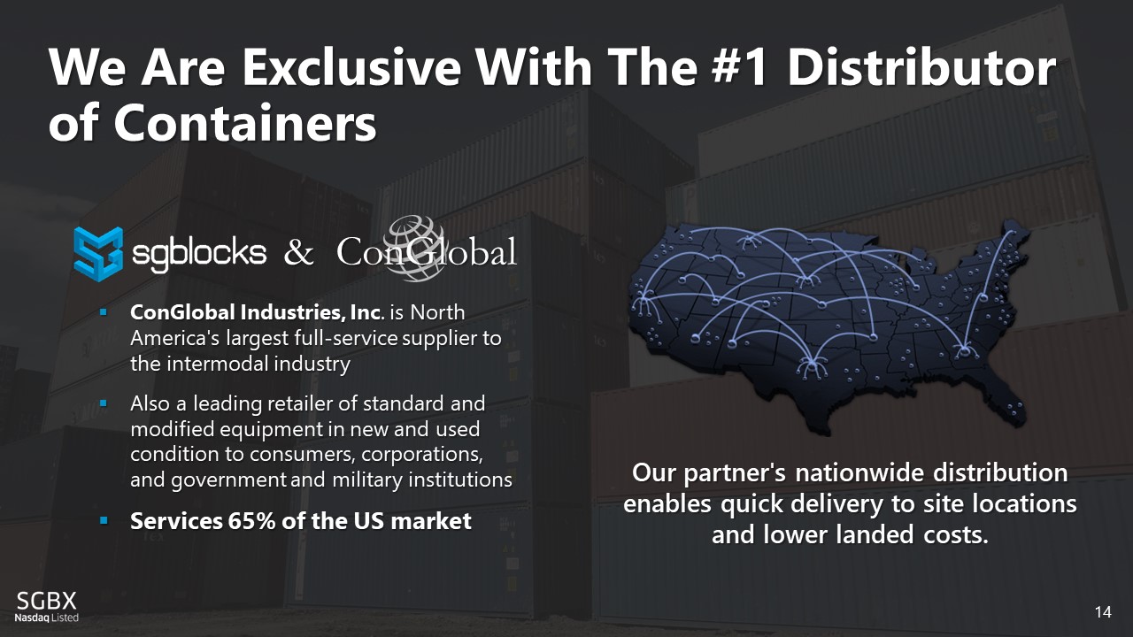 We Are Exclusive With The #1 Distributor of Containers ▪ ConGlobal Industries, Inc . is North America's largest full - service supplier to the intermodal industry ▪ Also a leading retailer of standard and modified equipment in new and used condition to consumers, corporations, and government and military institutions ▪ Services 65% of the US market Our partner's nationwide distribution enables quick delivery to site locations and lower landed costs . & ConGlobal 14