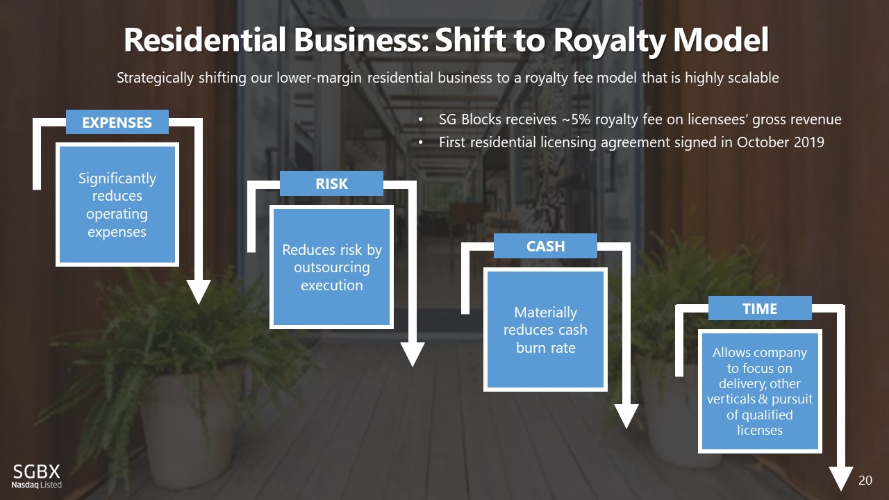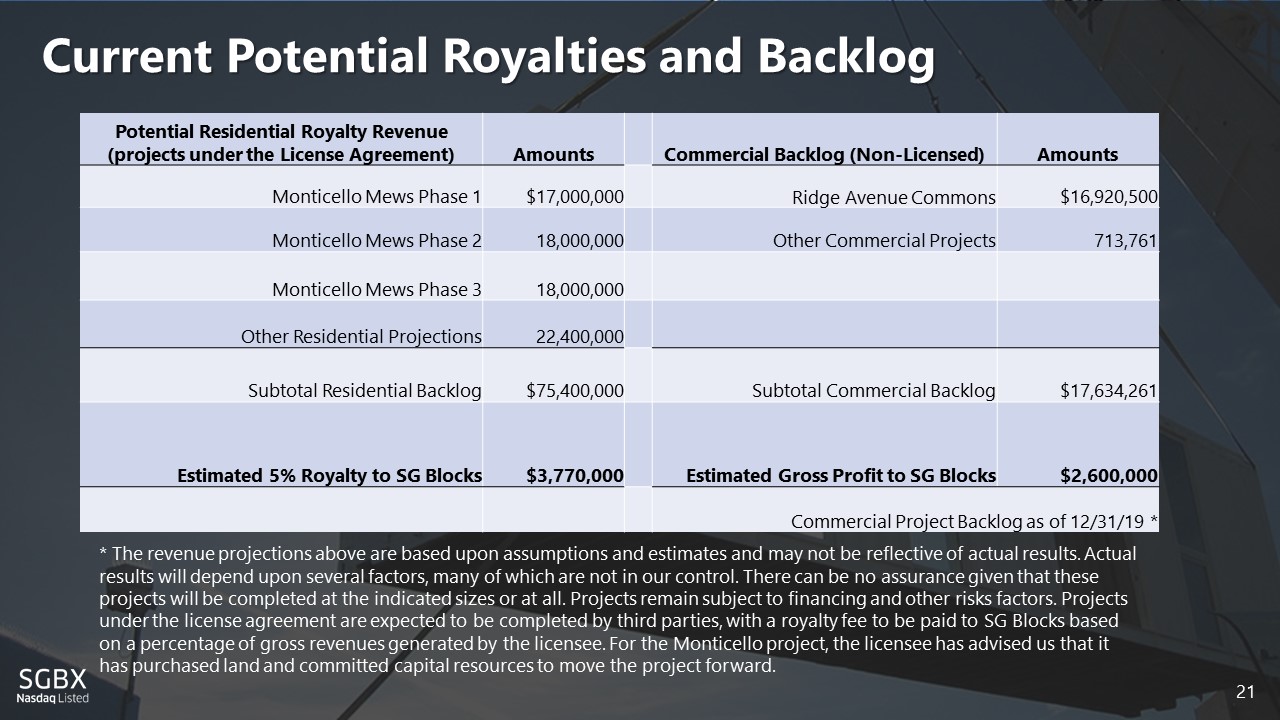 20 Residential Business: Shift to Royalty Model Strategically shifting our lower - margin residential business to a royalty fee model that is highly scalable Significantly reduces operating expenses EXPENSES Reduces risk by outsourcing execution RISK Materially reduces cash burn rate CASH Allows company to focus on delivery, other verticals & pursuit of qualified licenses TIME • SG Blocks receives ~5% royalty fee on licensees’ gross revenue • First residential licensing agreement signed in October 2019 20