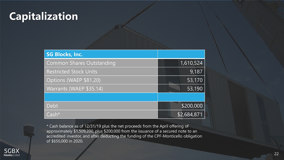 21 Current Potential Royalties and Backlog 21 Potential Residential Royalty Revenue (projects under the License Agreement) Amounts Commercial Backlog (Non - Licensed) Amounts Monticello Mews Phase 1 $17,000,000 Ridge Avenue Commons $16,920,500 Monticello Mews Phase 2 18,000,000 Other Commercial Projects 713,761 Monticello Mews Phase 3 18,000,000 Other Residential Projections 22,400,000 Subtotal Residential Backlog $75,400,000 Subtotal Commercial Backlog $17,634,261 Estimated 5% Royalty to SG Blocks $3,770,000 Estimated Gross Profit to SG Blocks $2,600,000 Commercial Project Backlog as of 12/31/19 * * The revenue projections above are based upon assumptions and estimates and may not be reflective of actual results. Actual results will depend upon several factors, many of which are not in our control. There can be no assurance given that these projects will be completed at the indicated sizes or at all. Projects remain subject to financing and other risks factors. Projects under the license agreement are expected to be completed by third parties, with a royalty fee to be paid to SG Blocks based on a percentage of gross revenues generated by the licensee. For the Monticello project, the licensee has advised us that it has purchased land and committed capital resources to move the project forward.