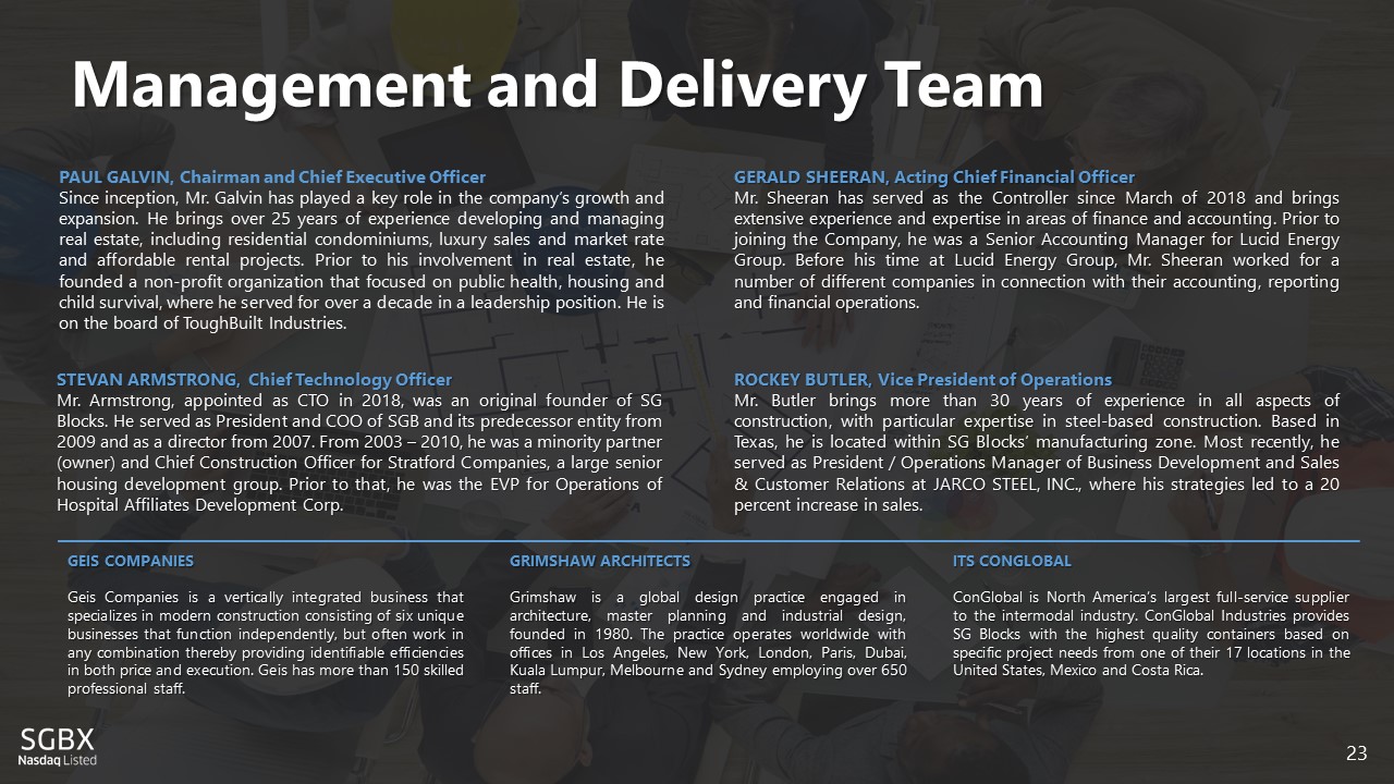Management and Delivery Team 23 PAUL GALVIN, Chairman and Chief Executive Officer Since inception, Mr . Galvin has played a key role in the company’s growth and expansion . He brings over 25 years of experience developing and managing real estate, including residential condominiums, luxury sales and market rate and affordable rental projects . Prior to his involvement in real estate, he founded a non - profit organization that focused on public health, housing and child survival, where he served for over a decade in a leadership position . He is on the board of ToughBuilt Industries . STEVAN ARMSTRONG, Chief Technology Officer Mr . Armstrong, appointed as CTO in 2018 , was an original founder of SG Blocks . He served as President and COO of SGB and its predecessor entity from 2009 and as a director from 2007 . From 2003 – 2010 , he was a minority partner (owner) and Chief Construction Officer for Stratford Companies, a large senior housing development group . Prior to that, he was the EVP for Operations of Hospital Affiliates Development Corp . GERALD SHEERAN, Acting Chief Financial Officer Mr . Sheeran has served as the Controller since March of 2018 and brings extensive experience and expertise in areas of finance and accounting . Prior to joining the Company, he was a Senior Accounting Manager for Lucid Energy Group . Before his time at Lucid Energy Group, Mr . Sheeran worked for a number of different companies in connection with their accounting, reporting and financial operations . ROCKEY BUTLER, Vice President of Operations Mr . Butler brings more than 30 years of experience in all aspects of construction, with particular expertise in steel - based construction . Based in Texas, he is located within SG Blocks’ manufacturing zone . Most recently, he served as President / Operations Manager of Business Development and Sales & Customer Relations at JARCO STEEL, INC . , where his strategies led to a 20 percent increase in sales . GEIS COMPANIES Geis Companies is a vertically integrated business that specializes in modern construction consisting of six unique businesses that function independently, but often work in any combination thereby providing identifiable efficiencies in both price and execution . Geis has more than 150 skilled professional staff . GRIMSHAW ARCHITECTS Grimshaw is a global design practice engaged in architecture, master planning and industrial design, founded in 1980 . The practice operates worldwide with offices in Los Angeles, New York, London, Paris, Dubai, Kuala Lumpur, Melbourne and Sydney employing over 650 staff . ITS CONGLOBAL ConGlobal is North America’s largest full - service supplier to the intermodal industry . ConGlobal Industries provides SG Blocks with the highest quality containers based on specific project needs from one of their 17 locations in the United States, Mexico and Costa Rica .