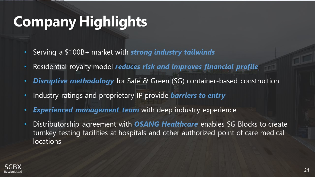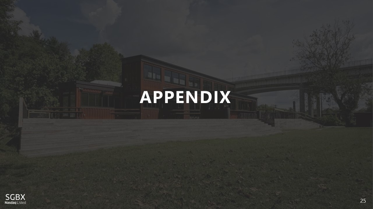 24 Company Highlights 24 • Serving a $100B+ market with strong industry tailwinds • Residential royalty model reduces risk and improves financial profile • Disruptive methodology for Safe & Green (SG) container - based construction • Industry ratings and proprietary IP provide barriers to entry • Experienced management team with deep industry experience • Distributorship agreement with OSANG Healthcare enables SG Blocks to create turnkey testing facilities at hospitals and other authorized point of care medical locations