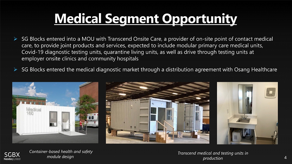 Medical Segment Opportunity 4 » SG Blocks entered into a MOU with Transcend Onsite Care, a provider of on - site point of contact medical care, to provide joint products and services, expected to include modular primary care medical units, Covid - 19 diagnostic testing units, quarantine living units, as well as drive through testing units at employer onsite clinics and community hospitals » SG Blocks entered the medical diagnostic market through a d istribution agreement with Osang Healthcare Transcend medical and testing units in production Container - based health and safety module design