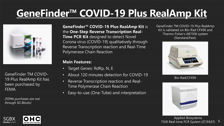 SG Blocks Enters the Medical Diagnostic Market Distribution Agreement with Osang Healthcare 5 » OSANG is a South Korean based global manufacturer and distributor of state - of - the - art medical supplies » OSANG currently exports its diagnostic biosensors for blood glucose, HbA1c and cholesterol » OSANG’s GeneFinder ™ COVID - 19 Plus RealAmp Kit is the One - Step Reverse Transcription Real - Time PCR Kit designed to detect Novel Corona virus (COVID - 19) qualitatively through Reverse Transcription reaction and Real - Time Polymerase Chain Reaction » Received European certification (CE - IVD) for its COVID - 19 test in February and local regulatory approval for exports in March » OSANG was a warded a FEMA contract in April 2020 for COVID - 19 test kits: https://www.cnn.com/2020/04/13/politics/south - korea - coronavirus - tests/index.html
