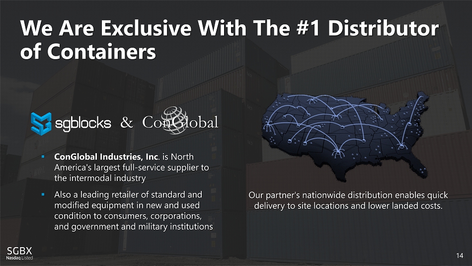 We Are Exclusive With The #1 Distributor of Containers ▪ ConGlobal Industries, Inc . is North America's largest full - service supplier to the intermodal industry ▪ Also a leading retailer of standard and modified equipment in new and used condition to consumers, corporations, and government and military institutions Our partner's nationwide distribution enables quick delivery to site locations and lower landed costs . & ConGlobal 14