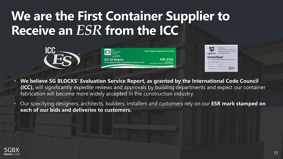 We are the First Container Supplier to Receive an ESR from the ICC ▪ We believe SG BLOCKS' Evaluation Service Report, as granted by the International Code Council (ICC), will significantly expedite reviews and approvals by building departments and expect our container fabrication will become more widely accepted in the construction industry. ▪ Our specifying designers, architects, builders, installers and customers rely on our ESR mark stamped on each of our bids and deliveries to customers. 15