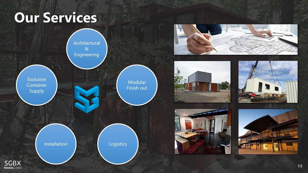 Signed MSA with World - Renowned Grimshaw Architects for Exclusive Container - Based Modular Design ▪ SG Blocks signed MSA with world - renowned Grimshaw Architects in June 2018 ▪ Grimshaw named SG Blocks’ premier design partner for current and future opportunities ▪ SG Blocks to be included into Grimshaw’s award - winning industrial design portfolio ▪ This expands SG Blocks’ A&E service offering to Grimshaw’s elite client base for world - class projects ▪ Thought leader for the future of industrial design integrating SG’s container - based modular structures 9 Pictured above: An excerpt of Grimshaw’s design portfolio using SG Blocks’ container - based structures. Click the above video link in the bottom left box to view an animation by Grimshaw of how containers can be used in construction. & NYC JFK Airport – Newark Liberty Int’l Airport – Tomorrowland Shanghai Disney Resort – Dubai Expo 2020 – HS2 London 2 9