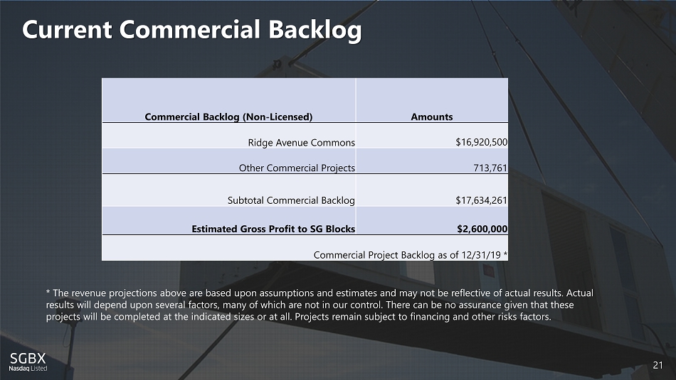 1 Current Commercial Backlog 21 Commercial Backlog (Non - Licensed) Amounts Ridge Avenue Commons $16,920,500 Other Commercial Projects 713,761 Subtotal Commercial Backlog $17,634,261 Estimated Gross Profit to SG Blocks $2,600,000 Commercial Project Backlog as of 12/31/19 * * The revenue projections above are based upon assumptions and estimates and may not be reflective of actual results. Actual results will depend upon several factors, many of which are not in our control. There can be no assurance given that these projects will be completed at the indicated sizes or at all. Projects remain subject to financing and other risks factors.