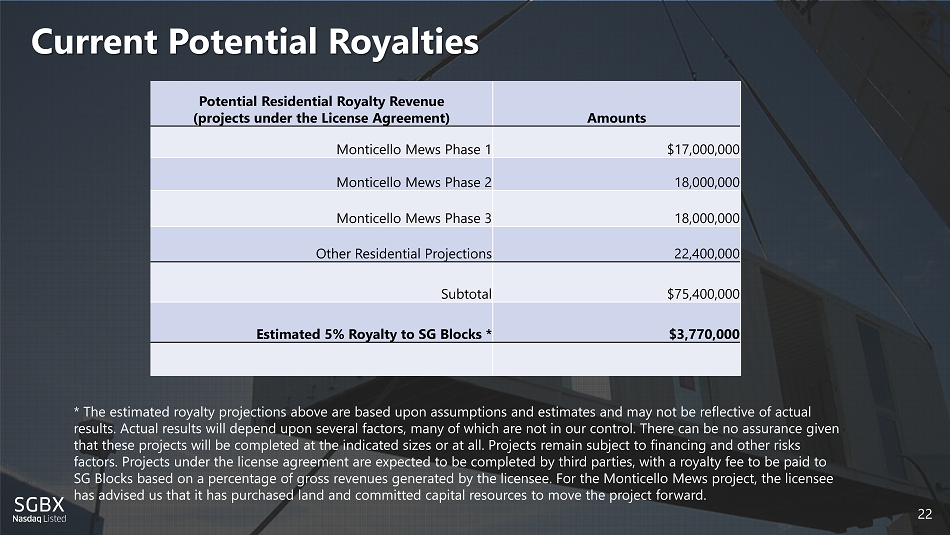 2 Current Potential Royalties 2 2 Potential Residential Royalty Revenue (projects under the License Agreement) Amounts Monticello Mews Phase 1 $17,000,000 Monticello Mews Phase 2 18,000,000 Monticello Mews Phase 3 18,000,000 Other Residential Projections 22,400,000 Subtotal $75,400,000 Estimated 5% Royalty to SG Blocks * $3,770,000 * The estimated royalty projections above are based upon assumptions and estimates and may not be reflective of actual results. Actual results will depend upon several factors, many of which are not in our control. There can be no assurance giv en that these projects will be completed at the indicated sizes or at all. Projects remain subject to financing and other risks factors. Projects under the license agreement are expected to be completed by third parties, with a royalty fee to be paid to SG Blocks based on a percentage of gross revenues generated by the licensee. For the Monticello Mews project, the licensee has advised us that it has purchased land and committed capital resources to move the project forward.