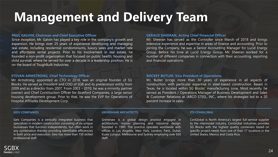 Management and Delivery Team 2 4 PAUL GALVIN, Chairman and Chief Executive Officer Since inception, Mr . Galvin has played a key role in the company’s growth and expansion . He brings over 25 years of experience developing and managing real estate, including residential condominiums, luxury sales and market rate and affordable rental projects . Prior to his involvement in real estate, he founded a non - profit organization that focused on public health, housing and child survival, where he served for over a decade in a leadership position . He is on the board of ToughBuilt Industries . STEVAN ARMSTRONG, Chief Technology Officer Mr . Armstrong, appointed as CTO in 2018 , was an original founder of SG Blocks . He served as President and COO of SGB and its predecessor entity from 2009 and as a director from 2007 . From 2003 – 2010 , he was a minority partner (owner) and Chief Construction Officer for Stratford Companies, a large senior housing development group . Prior to that, he was the EVP for Operations of Hospital Affiliates Development Corp . GERALD SHEERAN, Acting Chief Financial Officer Mr . Sheeran has served as the Controller since March of 2018 and brings extensive experience and expertise in areas of finance and accounting . Prior to joining the Company, he was a Senior Accounting Manager for Lucid Energy Group . Before his time at Lucid Energy Group, Mr . Sheeran worked for a number of different companies in connection with their accounting, reporting and financial operations . ROCKEY BUTLER, Vice President of Operations Mr . Butler brings more than 30 years of experience in all aspects of construction, with particular expertise in steel - based construction . Based in Texas, he is located within SG Blocks’ manufacturing zone . Most recently, he served as President / Operations Manager of Business Development and Sales & Customer Relations at JARCO STEEL, INC . , where his strategies led to a 20 percent increase in sales . GEIS COMPANIES Geis Companies is a vertically integrated business that specializes in modern construction consisting of six unique businesses that function independently, but often work in any combination thereby providing identifiable efficiencies in both price and execution . Geis has more than 150 skilled professional staff . GRIMSHAW ARCHITECTS Grimshaw is a global design practice engaged in architecture, master planning and industrial design, founded in 1980 . The practice operates worldwide with offices in Los Angeles, New York, London, Paris, Dubai, Kuala Lumpur, Melbourne and Sydney employing over 650 staff . ITS CONGLOBAL ConGlobal is North America’s largest full - service supplier to the intermodal industry . ConGlobal Industries provides SG Blocks with the highest quality containers based on specific project needs from one of their 17 locations in the United States, Mexico and Costa Rica .