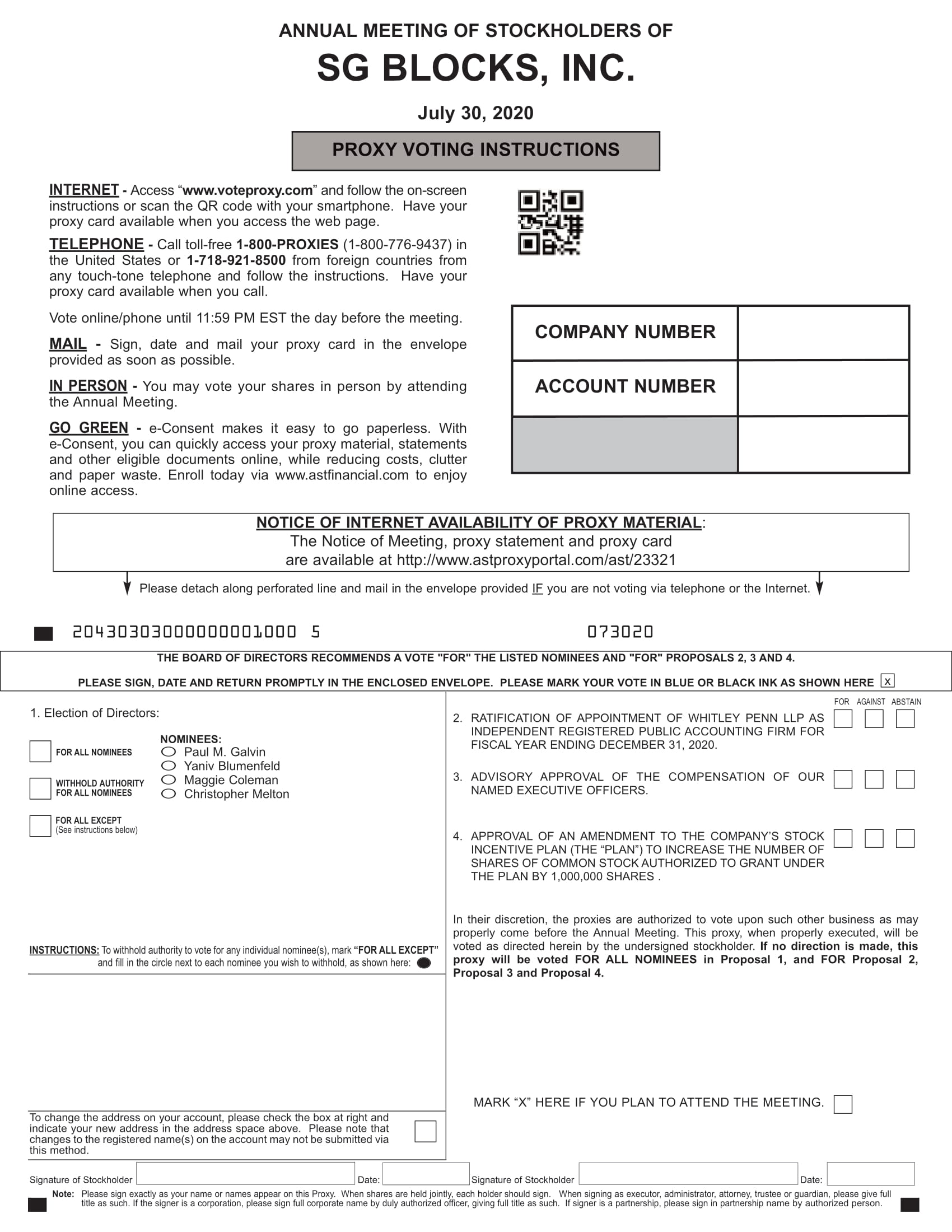 | A: | The rules of the Securities and Exchange Commission (the “SEC”) permit us to make our proxy materials available in one of two ways: the “full set delivery” option or the “notice only” option. A company may use a single method for all of its stockholders or may use both methods. We have elected to use the full set delivery option to deliver the proxy materials for the 2020 Annual Meeting to each stockholder of record as of the Record Date (as defined below). As such, on or about June 30, 2020, we will be mailing paper copies of our proxy materials to stockholders, as well as providing access to the proxy materials at www.sgblocks.com or www.astproxyportal.com/ast/23321. We may decide not to use the full set delivery option in the future; however, you will still have the right to request a free set of proxy materials by mail. |