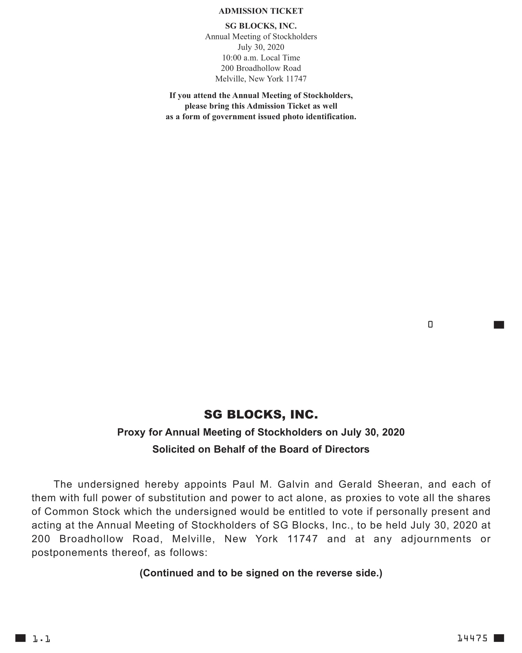 We hereby notify you that the 2020 Annual Meeting of Stockholders (the “2020 Annual Meeting” or “Annual Meeting”) of SG Blocks, Inc., a Delaware corporation, will be held on July 30, 2020 beginning at 10:00 a.m., local time be held at 200 Broadhollow Road, Melville, New York 11747, for the following purposes: