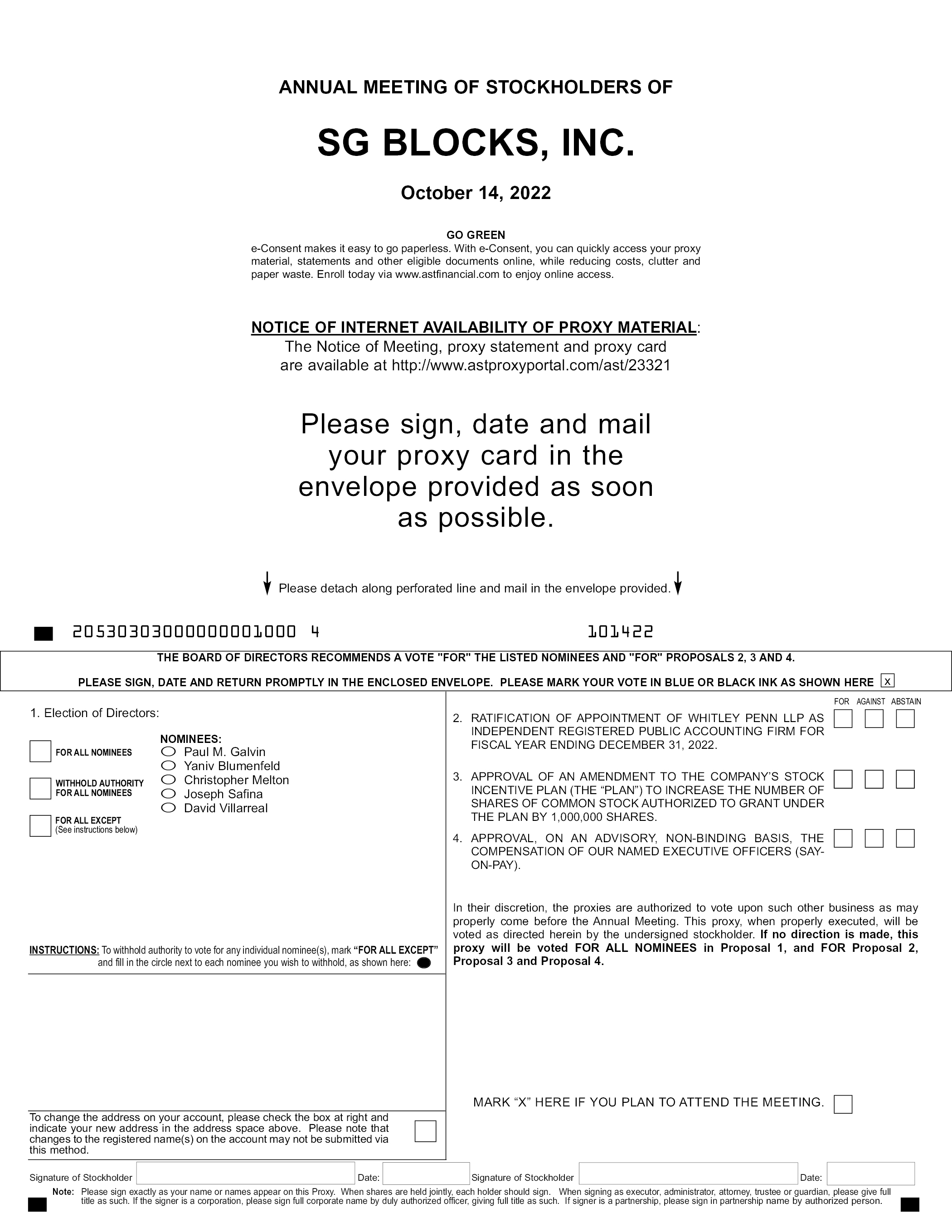 ANNUAL MEETING OF STOCKHOLDERS OF SG BLOCKS, INC. October 14, 2022 GO GREEN e-Consent makes it easy to go paperless. With e-Consent, you can quickly access your proxy material, statements and other eligible documents online, while reducing costs, clutter and paper waste. Enroll today via www.astfinancial.com to enjoy online access. NOTICE OF INTERNET AVAILABILITY OF PROXY MATERIAL: The Notice of Meeting, proxy statement and proxy card are available at http://www.astproxyportal.com/ast/23321 Please sign, date and mail your proxy card in the envelope provided as soon as possible. Please detach along perforated line and mail in the envelope provided. 20530303000000001000 4 101422 THE BOARD OF DIRECTORS RECOMMENDS A VOTE “FOR” THE LISTED NOMINEES AND “FOR” PROPOSALS 2, 3 AND 4. PLEASE SIGN, DATE AND RETURN PROMPTLY IN THE ENCLOSED ENVELOPE. PLEASE MARK YOUR VOTE IN BLUE OR BLACK INK AS SHOWN HERE Election of Directors: NOMINEES: FOR ALL NOMINEES WITHHOLD AUTHORITY FOR ALL NOMINEES FOR ALL EXCEPT (See instructions below) Paul M. Galvin Yaniv Blumenfeld Christopher Melton Joseph Safina David Villarreal FOR AGAINST ABSTAIN 2. RATIFICATION OF APPOINTMENT OF WHITLEY PENN LLP AS INDEPENDENT REGISTERED PUBLIC ACCOUNTING FIRM FOR FISCAL YEAR ENDING DECEMBER 31, 2022. 3. APPROVAL OF AN AMENDMENT TO THE COMPANY’S STOCK INCENTIVE PLAN (THE “PLAN”) TO INCREASE THE NUMBER OF SHARES OF COMMON STOCK AUTHORIZED TO GRANT UNDER THE PLAN BY 1,000,000 SHARES. 4. APPROVAL, ON AN ADVISORY, NON-BINDING BASIS, THE COMPENSATION OF OUR NAMED EXECUTIVE OFFICERS (SAYON-PAY). In their discretion, the proxies are authorized to vote upon such other business as may properly come before the Annual Meeting. This proxy, when properly executed, will be voted as directed herein by the undersigned stockholder. If no direction is made, this proxy will be voted FOR ALL NOMINEES in Proposal 1, and FOR Proposal 2, Proposal 3 and Proposal 4. INSTRUCTIONS: To withhold authority to vote for any individual nominee(s), mark “FOR ALL EXCEPT” and fill in the circle next to each nominee you wish to withhold, as shown here: To change the address on your account, please check the box at right and indicate your new address in the address space above. Please note that changes to the registered name(s) on the account may not be submitted via this method. MARK “X” HERE IF YOU PLAN TO ATTEND THE MEETING. Signature of Stockholder Date: Signature of Stockholder Date: Note: Please sign exactly as your name or names appear on this Proxy. When shares are held jointly, each holder should sign. When signing as executor, administrator, attorney, trustee or guardian, please give full title as such. If the signer is a corporation, please sign full corporate name by duly authorized officer, giving full title as such. If signer is a partnership, please sign in partnership name by authorized person.