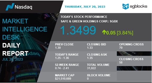 JULY 21, 2023 – MIAMI, Fla. – Safe & Green Holdings Corp. (NASDAQ: SGBX) (“Safe & Green Holdings” or the “Company”), a leading developer, designer, and fabricator of modular structures for residential, commercial, and point-of-care medicine, today announced that the Company received notice from Nasdaq on July 20, 2023, indicating that it has regained compliance with the minimum bid price requirement under Nasdaq Rules 5550(a)(2).