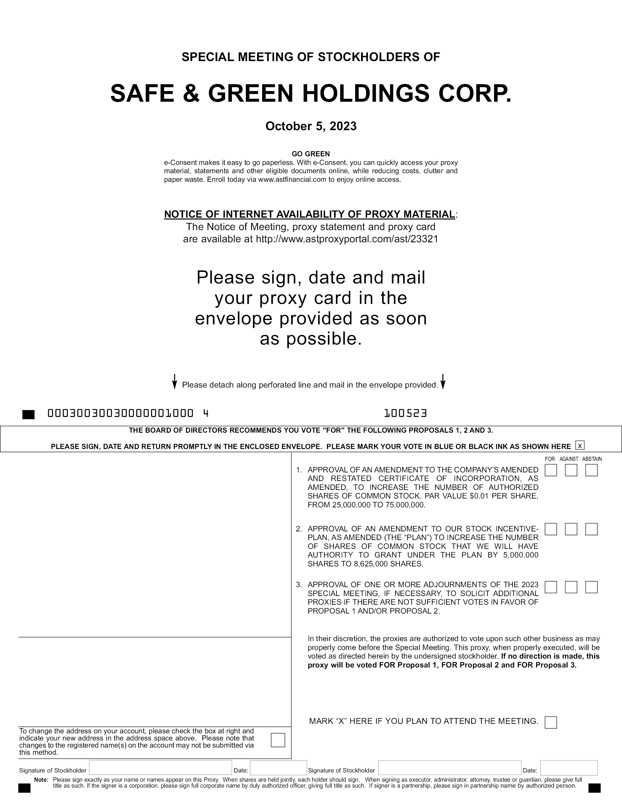 SPECIAL MEETING OF STOCKHOLDERS OF SAFE & GREEN HOLDINGS CORP. October 5, 2023 GO GREEN e-Consent makes it easy to go paperless. With e-Consent, you can quickly access your proxy material, statements and other eligible documents online, while reducing costs, clutter and paper waste. Enroll today via www.astfinancial.com to enjoy online access. NOTICE OF INTERNET AVAILABILITY OF PROXY MATERIAL: The Notice of Meeting, proxy statement and proxy card are available at http://www.astproxyportal.com/ast/23321 Please sign, date and mail your proxy card in the envelope provided as soon as possible. Please detach along perforated line and mail in the envelope provided 00030030030000001000 4 100523 THE BOARD OF DIRECTORS RECOMMENDS YOU VOTE “FOR” THE FOLLOWING PROPOSALS 1, 2 AND 3. PLEASE SIGN, DATE AND RETURN PROMPTLY IN THE ENCLOSED ENVELOPE. PLEASE MARK YOUR VOTE IN BLUE OR BLACK INK AS SHOWN HERE FOR AGAINST ABSTAIN 1. APPROVAL OF AN AMENDMENT TO THE COMPANY’S AMENDED AND RESTATED CERTIFICATE OF INCORPORATION, AS AMENDED, TO INCREASE THE NUMBER OF AUTHORIZED SHARES OF COMMON STOCK, PAR VALUE $0.01 PER SHARE, FROM 25,000,000 TO 75,000,000. 2. APPROVAL OF AN AMENDMENT TO OUR STOCK INCENTIVEPLAN, AS AMENDED (THE “PLAN”) TO INCREASE THE NUMBER OF SHARES OF COMMON STOCK THAT WE WILL HAVE AUTHORITY TO GRANT UNDER THE PLAN BY 5,000,000 SHARES TO 8,625,000 SHARES. 3. APPROVAL OF ONE OR MORE ADJOURNMENTS OF THE 2023 SPECIAL MEETING, IF NECESSARY, TO SOLICIT ADDITIONAL PROXIES IF THERE ARE NOT SUFFICIENT VOTES IN FAVOR OF PROPOSAL 1 AND/OR PROPOSAL 2. In their discretion, the proxies are authorized to vote upon such other business as may properly come before the Special Meeting. This proxy, when properly executed, will be voted as directed herein by the undersigned stockholder. If no direction is made, this proxy will be voted FOR Proposal 1, FOR Proposal 2 and FOR Proposal 3. MARK “X” HERE IF YOU PLAN TO ATTEND THE MEETING. To change the address on your account, please check the box at right and indicate your new address in the address space above. Please note that changes to the registered name(s) on the account may not be submitted via this method. Signature of Stockholder Date: Signature of Stockholder Date: Note: Please sign exactly as your name or names appear on this Proxy. When shares are held jointly, each holder should sign. When signing as executor, administrator, attorney, trustee or guardian, please give full title as such. If the signer is a corporation, please sign full corporate name by duly authorized officer, giving full title as such. If signer is a partnership, please sign in partnership name by authorized person.