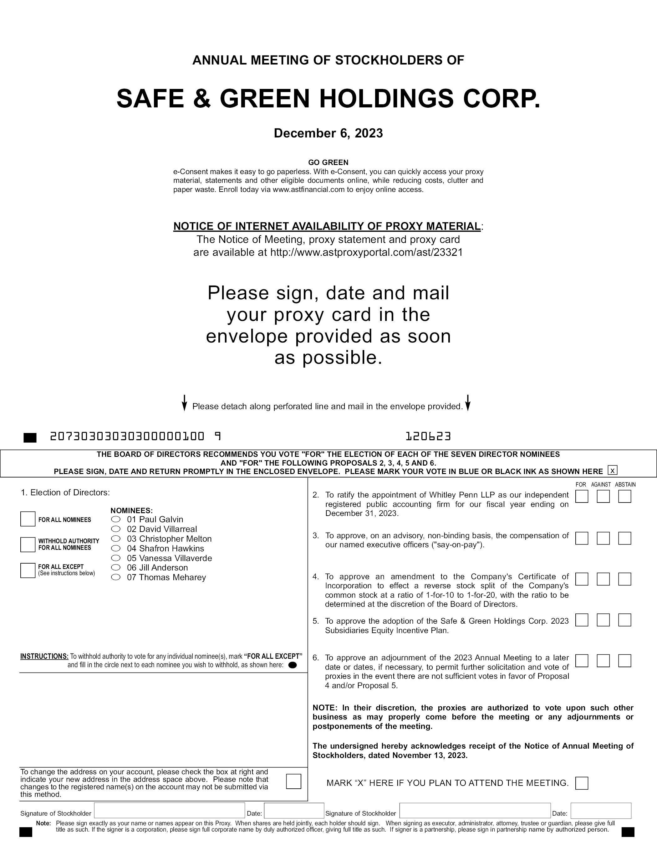 ANNUAL MEETING OF STOCKHOLDERS OF SAFE & GREEN HOLDINGS CORP. December 6, 2023 GO GREEN e-Consent makes it easy to go paperless. With e-Consent, you can quickly access your proxy material, statements and other eligible documents online, while reducing costs, clutter and paper waste. Enroll today via www.astfinancial.com to enjoy online access. NOTICE OF INTERNET AVAILABILITY OF PROXY MATERIAL: The Notice of Meeting, proxy statement and proxy card are available at http://www.astproxyportal.com/ast/23321 Please sign, date and mail your proxy card in the envelope provided as soon as possible. Note: Please sign exactly as your name or names appear on this Proxy. When shares are held jointly, each holder should sign. When signing as executor, administrator, attorney, trustee or guardian, please give full title as such. If the signer is a corporation, please sign full corporate name by duly authorized officer, giving full title as such. If signer is a partnership, please sign in partnership name by authorized person. To change the address on your account, please check the box at right and indicate your new address in the address space above. Please note that changes to the registered name(s) on the account may not be submitted via this method. THE BOARD OF DIRECTORS RECOMMENDS YOU VOTE “FOR” THE ELECTION OF EACH OF THE SEVEN DIRECTOR NOMINEES AND “FOR” THE FOLLOWING PROPOSALS 2, 3, 4, 5 AND 6. PLEASE SIGN, DATE AND RETURN PROMPTLY IN THE ENCLOSED ENVELOPE. PLEASE MARK YOUR VOTE IN BLUE OR BLACK INK AS SHOWN HERE Please detach along perforated line and mail in the envelope provided. 20730303030300000100 9 120623 MARK “X” HERE IF YOU PLAN TO ATTEND THE MEETING. INSTRUCTIONS: To withhold authority to vote for any individual nominee(s), mark “FOR ALL EXCEPT” and fill in the circle next to each nominee you wish to withhold, as shown here: 1. Election of Directors: 01 Paul Galvin 02 David Villarreal 03 Christopher Melton 04 Shafron Hawkins 05 Vanessa Villaverde 06 Jill Anderson 07 Thomas Meharey FOR ALL NOMINEES WITHHOLD AUTHORITY FOR ALL NOMINEES FOR ALL EXCEPT (See instructions below) NOMINEES: 2. To ratify the appointment of Whitley Penn LLP as our independent registered public accounting firm for our fiscal year ending on December 31, 2023. 3. To approve, on an advisory, non-binding basis, the compensation of our named executive officers (“say-on-pay”). 4. To approve an amendment to the Company’s Certificate of Incorporation to effect a reverse stock split of the Company’s common stock at a ratio of 1-for-10 to 1-for-20, with the ratio to be determined at the discretion of the Board of Directors. 5. To approve the adoption of the Safe & Green Holdings Corp. 2023 Subsidiaries Equity Incentive Plan. 6. To approve an adjournment of the 2023 Annual Meeting to a later date or dates, if necessary, to permit further solicitation and vote of proxies in the event there are not sufficient votes in favor of Proposal 4 and/or Proposal 5. Signature of Stockholder Date: Signature of Stockholder Date: NOTE: In their discretion, the proxies are authorized to vote upon such other business as may properly come before the meeting or any adjournments or postponements of the meeting. The undersigned hereby acknowledges receipt of the Notice of Annual Meeting of Stockholders, dated November 13, 2023. FOR AGAINST ABSTAIN