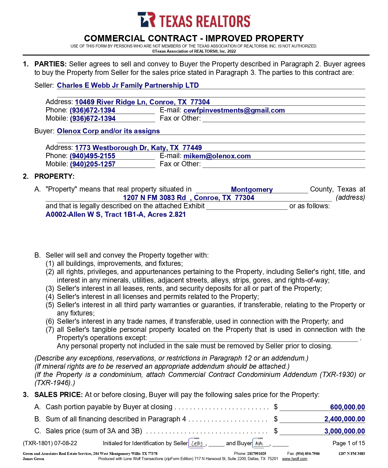 COMMERCIAL CONTRACT - IMPROVED PROPERTY USE OF THIS FORM BY PERSONS WHO ARE NOT MEMBERS OF THE TEXAS ASSOCIATION OF REALTORS®, INC. IS NOT AUTHORIZED. ©Texas Association of REALTORS®, Inc. 2022 1. PARTIES: Seller agrees to sell and convey to Buyer the Property described in Paragraph 2. Buyer agrees to buy the Property from Seller for the sales price stated in Paragraph 3. The parties to this contract are: Seller: Charles E Webb Jr Family Partnership LTD Address : 10469 River Ridge Ln, Conroe, TX 77304 Phone : ( 936 ) 672 - 1394 E - mail : cewfpinvestments@gmail . com Mobile : ( 936 ) 672 - 1394 Fax or Other : Buyer: Olenox Corp and/or its assigns Address : 1773 Westborough Dr, Katy, TX 77449 Phone : ( 940 ) 495 - 2155 E - mail : mikem@olenox . com Mobile : ( 940 ) 205 - 1257 Fax or Other : 2. PROPERTY: A. "Property" means that real property situated in Montgomery County, Texas at 1207 N FM 3083 Rd , Conroe, TX 77304 (address) and that is legally described on the attached Exhibit or as follows: A0002 - Allen W S, Tract 1B1 - A, Acres 2.821 B. Seller will sell and convey the Property together with: (1) all buildings, improvements, and fixtures; (2) all rights, privileges, and appurtenances pertaining to the Property, including Seller's right, title, and interest in any minerals, utilities, adjacent streets, alleys, strips, gores, and rights - of - way; (3) Seller's interest in all leases, rents, and security deposits for all or part of the Property; (4) Seller's interest in all licenses and permits related to the Property; (5) Seller's interest in all third party warranties or guaranties, if transferable, relating to the Property or any fixtures; (6) Seller's interest in any trade names, if transferable, used in connection with the Property; and (7) all Seller's tangible personal property located on the Property that is used in connection with the Property's operations except: . Any personal property not included in the sale must be removed by Seller prior to closing. (Describe any exceptions, reservations, or restrictions in Paragraph 12 or an addendum.) (If mineral rights are to be reserved an appropriate addendum should be attached.) (If the Property is a condominium, attach Commercial Contract Condominium Addendum (TXR - 1930) or (TXR - 1946).) 3. SALES PRICE: At or before closing, Buyer will pay the following sales price for the Property: A. Cash portion payable by Buyer at closing . . . . . . . . . . . . . . . . . . . . . . . . . B. Sum of all financing described in Paragraph 4 . . . . . . . . . . . . . . . . . . . . . C. Sales price (sum of 3A and 3B) . . . . . . . . . . . . . . . . . . . . . . . . . . . . . . . . $ 600,000.00 $ 2,400,000.00 $ 3,000,000.00 (TXR - 1801) 07 - 08 - 22 Initialed for Identification by Seller , and Buyer , Page 1 of 15 Green and Associates Real Estate Services, 204 West Montgomery Willis TX 77378 Phone: 2817991029 Fax: (936) 856 - 7986 1207 N FM 3083 Produced with Lone Wolf Transactions (zipForm Edition) 717 N Harwood St, Suite 2200, Dallas, TX 75201 www.lwolf.com James Green