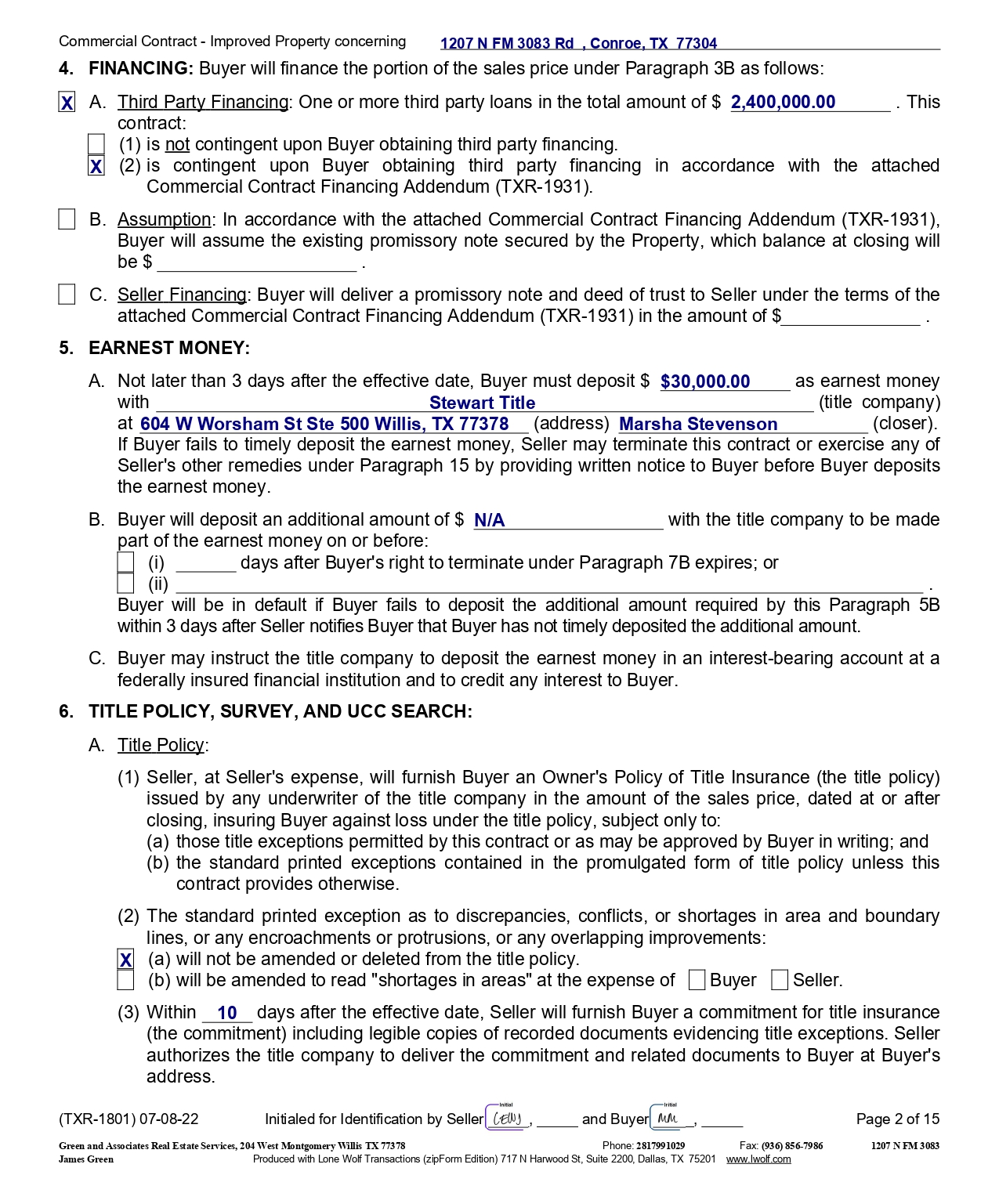 Commercial Contract - Improved Property concerning (1) is not contingent upon Buyer obtaining third party financing. (2) is contingent upon Buyer obtaining third party financing in accordance with the attached Commercial Contract Financing Addendum (TXR - 1931). 4. FINANCING: Buyer will finance the portion of the sales price under Paragraph 3B as follows: X A. Third Party Financing : One or more third party loans in the total amount of $ 2,400,000.00 . This contract: B . Assumption : In accordance with the attached Commercial Contract Financing Addendum (TXR - 1931 ), Buyer will assume the existing promissory note secured by the Property, which balance at closing will be $ . C . Seller Financing : Buyer will deliver a promissory note and deed of trust to Seller under the terms of the attached Commercial Contract Financing Addendum (TXR - 1931 ) in the amount of $ . 5. EARNEST MONEY: A. B. (i) days after Buyer's right to terminate under Paragraph 7B expires; or (ii) . Buyer will be in default if Buyer fails to deposit the additional amount required by this Paragraph 5B within 3 days after Seller notifies Buyer that Buyer has not timely deposited the additional amount. C. Buyer may instruct the title company to deposit the earnest money in an interest - bearing account at a federally insured financial institution and to credit any interest to Buyer. 6. TITLE POLICY, SURVEY, AND UCC SEARCH: A. Title Policy : (1) Seller, at Seller's expense, will furnish Buyer an Owner's Policy of Title Insurance (the title policy) issued by any underwriter of the title company in the amount of the sales price, dated at or after closing, insuring Buyer against loss under the title policy, subject only to : (a) those title exceptions permitted by this contract or as may be approved by Buyer in writing ; and (b) the standard printed exceptions contained in the promulgated form of title policy unless this contract provides otherwise . (2) The standard printed exception as to discrepancies, conflicts, or shortages in area and boundary lines, or any encroachments or protrusions, or any overlapping improvements : (a) will not be amended or deleted from the title policy. (b) will be amended to read "shortages in areas" at the expense of Buyer Seller. Not later than 3 days after the effective date, Buyer must deposit $ $ 30 , 000 . 00 as earnest money with Stewart Title (title company) at 604 W Worsham St Ste 500 Willis, TX 77378 (address) Marsha Stevenson (closer) . If Buyer fails to timely deposit the earnest money, Seller may terminate this contract or exercise any of Seller's other remedies under Paragraph 15 by providing written notice to Buyer before Buyer deposits the earnest money . Buyer will deposit an additional amount of $ N/A with the title company to be made part of the earnest money on or before : ( 3 ) Within 10 days after the effective date, Seller will furnish Buyer a commitment for title insurance (the commitment) including legible copies of recorded documents evidencing title exceptions . Seller authorizes the title company to deliver the commitment and related documents to Buyer at Buyer's address . (TXR - 1801) 07 - 08 - 22 Initialed for Identification by Seller , and Buyer , Green and Associates Real Estate Services, 204 West Montgomery Willis TX 77378 Phone: 2817991029 Fax: (936) 856 - 7986 Page 2 of 15 1207 N FM 3083 1207 N FM 3083 Rd , Conroe, TX 77304 X X James Green Produced with Lone Wolf Transactions (zipForm Edition) 717 N Harwood St, Suite 2200, Dallas, TX 75201 www.lwolf.com