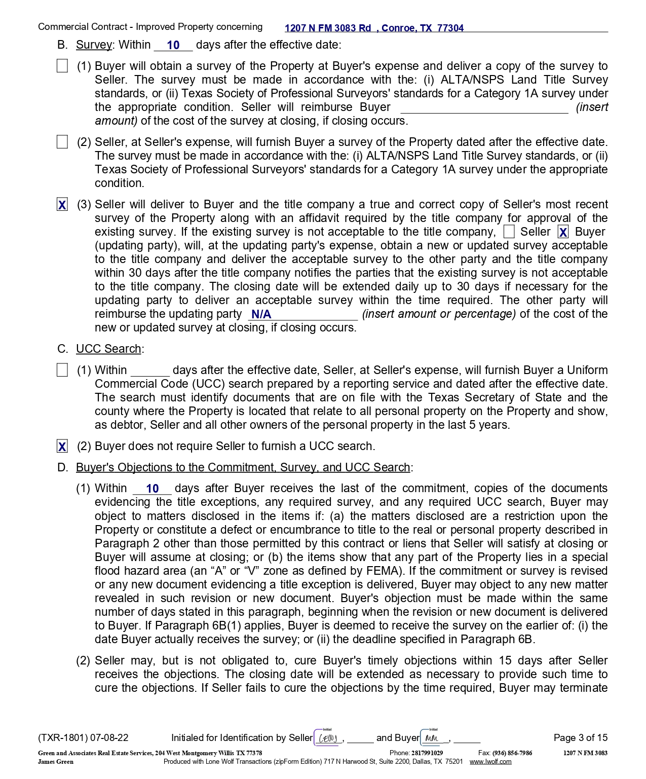 Commercial Contract - Improved Property concerning B. 1207 N FM 3083 Rd , Conroe, TX 77304 Survey : Within 10 days after the effective date : (1) Buyer will obtain a survey of the Property at Buyer's expense and deliver a copy of the survey to Seller . The survey must be made in accordance with the : (i) ALTA/NSPS Land Title Survey standards, or (ii) Texas Society of Professional Surveyors' standards for a Category 1 A survey under the appropriate condition . Seller will reimburse Buyer (insert amount) of the cost of the survey at closing, if closing occurs . (2) Seller, at Seller's expense, will furnish Buyer a survey of the Property dated after the effective date . The survey must be made in accordance with the : (i) ALTA/NSPS Land Title Survey standards, or (ii) Texas Society of Professional Surveyors' standards for a Category 1 A survey under the appropriate condition . (3) Seller will deliver to Buyer and the title company a true and correct copy of Seller's most recent survey of the Property along with an affidavit required by the title company for approval of the existing survey . If the existing survey is not acceptable to the title company, Seller X Buyer (updating party), will, at the updating party's expense, obtain a new or updated survey acceptable to the title company and deliver the acceptable survey to the other party and the title company within 30 days after the title company notifies the parties that the existing survey is not acceptable to the title company . The closing date will be extended daily up to 30 days if necessary for the updating party to deliver an acceptable survey within the time required . The other party will reimburse the updating party N/A (insert amount or percentage) of the cost of the new or updated survey at closing, if closing occurs . C. UCC Search : ( 1 ) Within days after the effective date, Seller, at Seller's expense, will furnish Buyer a Uniform Commercial Code (UCC) search prepared by a reporting service and dated after the effective date . The search must identify documents that are on file with the Texas Secretary of State and the county where the Property is located that relate to all personal property on the Property and show, as debtor, Seller and all other owners of the personal property in the last 5 years . X (2) Buyer does not require Seller to furnish a UCC search. D. Buyer's Objections to the Commitment, Survey, and UCC Search : (1) Within 10 days after Buyer receives the last of the commitment, copies of the documents evidencing the title exceptions, any required survey, and any required UCC search, Buyer may object to matters disclosed in the items if : (a) the matters disclosed are a restriction upon the Property or constitute a defect or encumbrance to title to the real or personal property described in Paragraph 2 other than those permitted by this contract or liens that Seller will satisfy at closing or Buyer will assume at closing ; or (b) the items show that any part of the Property lies in a special flood hazard area (an “A” or “V” zone as defined by FEMA) . If the commitment or survey is revised or any new document evidencing a title exception is delivered, Buyer may object to any new matter revealed in such revision or new document . Buyer's objection must be made within the same number of days stated in this paragraph, beginning when the revision or new document is delivered to Buyer . If Paragraph 6 B( 1 ) applies, Buyer is deemed to receive the survey on the earlier of : (i) the date Buyer actually receives the survey ; or (ii) the deadline specified in Paragraph 6 B . (2) Seller may, but is not obligated to, cure Buyer's timely objections within 15 days after Seller receives the objections . The closing date will be extended as necessary to provide such time to cure the objections . If Seller fails to cure the objections by the time required, Buyer may terminate X (TXR - 1801) 07 - 08 - 22 Initialed for Identification by Seller , and Buyer , Page 3 of 15 1207 N FM 3083 Green and Associates Real Estate Services, 204 West Montgomery Willis TX 77378 Phone: 2817991029 Fax: (936) 856 - 7986 James Green Produced with Lone Wolf Transactions (zipForm Edition) 717 N Harwood St, Suite 2200, Dallas, TX 75201 www.lwolf.com