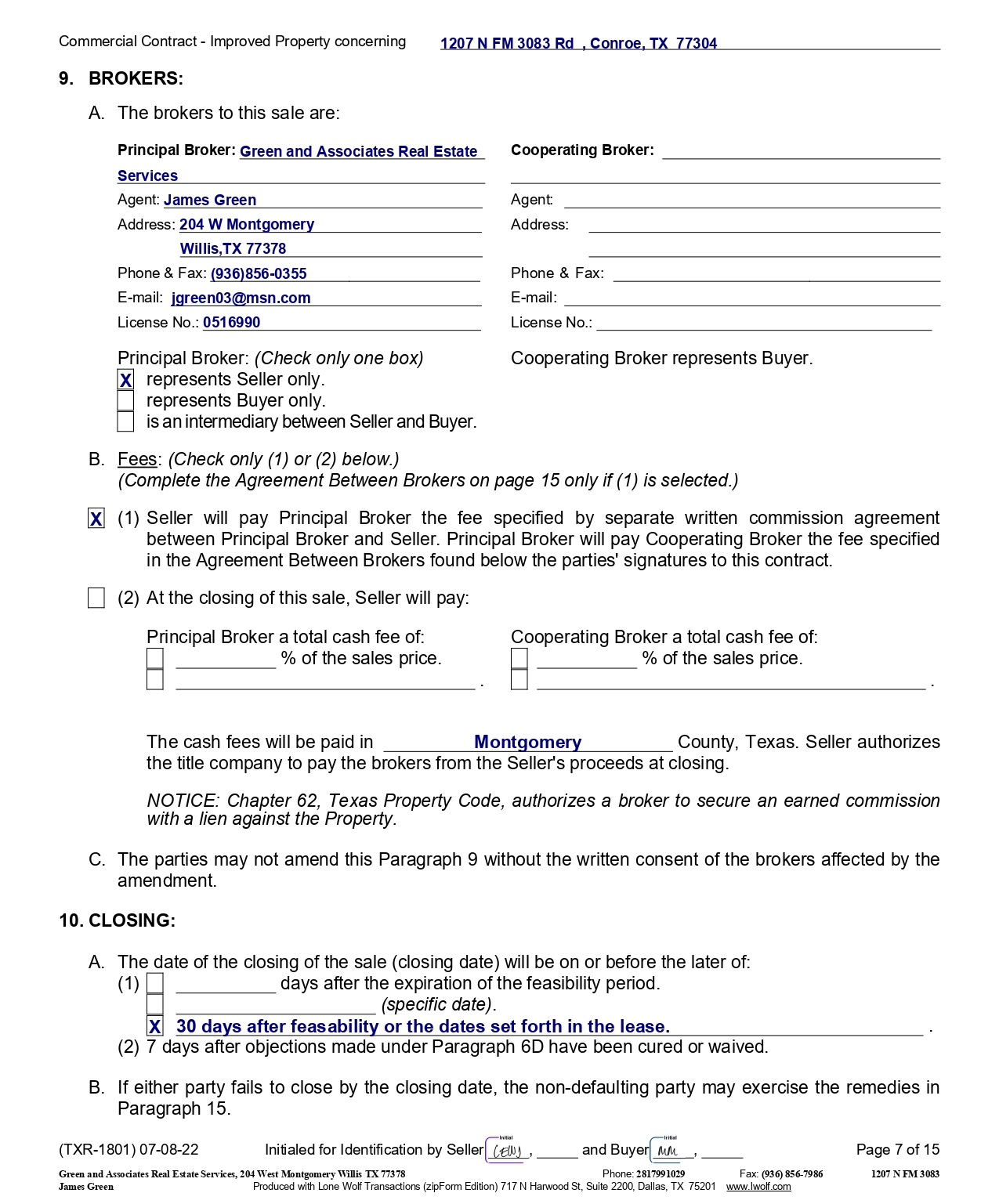 Commercial Contract - Improved Property concerning 9. BROKERS: A. The brokers to this sale are: Principal Broker: Green and Associates Real Estate Services Agent: James Green Address: 204 W Montgomery Willis,TX 77378 Phone & Fax : ( 936 ) 856 - 0355 E - mail : jgreen 03 @msn . com License No .: 0516990 Phone & Fax : E - mail : License No .: Cooperating Broker: Agent: Address: Principal Broker: (Check only one box) Cooperating Broker represents Buyer. represents Seller only. represents Buyer only. is an intermediary between Seller and Buyer. B. Fees : (Check only (1) or (2) below.) (Complete the Agreement Between Brokers on page 15 only if (1) is selected.) X ( 1 ) Seller will pay Principal Broker the fee specified by separate written commission agreement between Principal Broker and Seller . Principal Broker will pay Cooperating Broker the fee specified in the Agreement Between Brokers found below the parties' signatures to this contract . (2) At the closing of this sale, Seller will pay: Principal Broker a total cash fee of: % of the sales price. . Cooperating Broker a total cash fee of: % of the sales price. . (1) (2) 7 days after objections made under Paragraph 6D have been cured or waived. B. If either party fails to close by the closing date, the non - defaulting party may exercise the remedies in Paragraph 15. (TXR - 1801) 07 - 08 - 22 Initialed for Identification by Seller , and Buyer , Page 7 of 15 The cash fees will be paid in Montgomery County, Texas. Seller authorizes the title company to pay the brokers from the Seller's proceeds at closing. NOTICE: Chapter 62, Texas Property Code, authorizes a broker to secure an earned commission with a lien against the Property. C. The parties may not amend this Paragraph 9 without the written consent of the brokers affected by the amendment. 10. CLOSING: A. The date of the closing of the sale (closing date) will be on or before the later of: X days after the expiration of the feasibility period. (specific date) . 30 days after feasability or the dates set forth in the lease. . 1207 N FM 3083 Rd , Conroe, TX 77304 X Green and Associates Real Estate Services, 204 West Montgomery Willis TX 77378 Phone: 2817991029 Fax: (936) 856 - 7986 1207 N FM 3083 James Green Produced with Lone Wolf Transactions (zipForm Edition) 717 N Harwood St, Suite 2200, Dallas, TX 75201 www.lwolf.com
