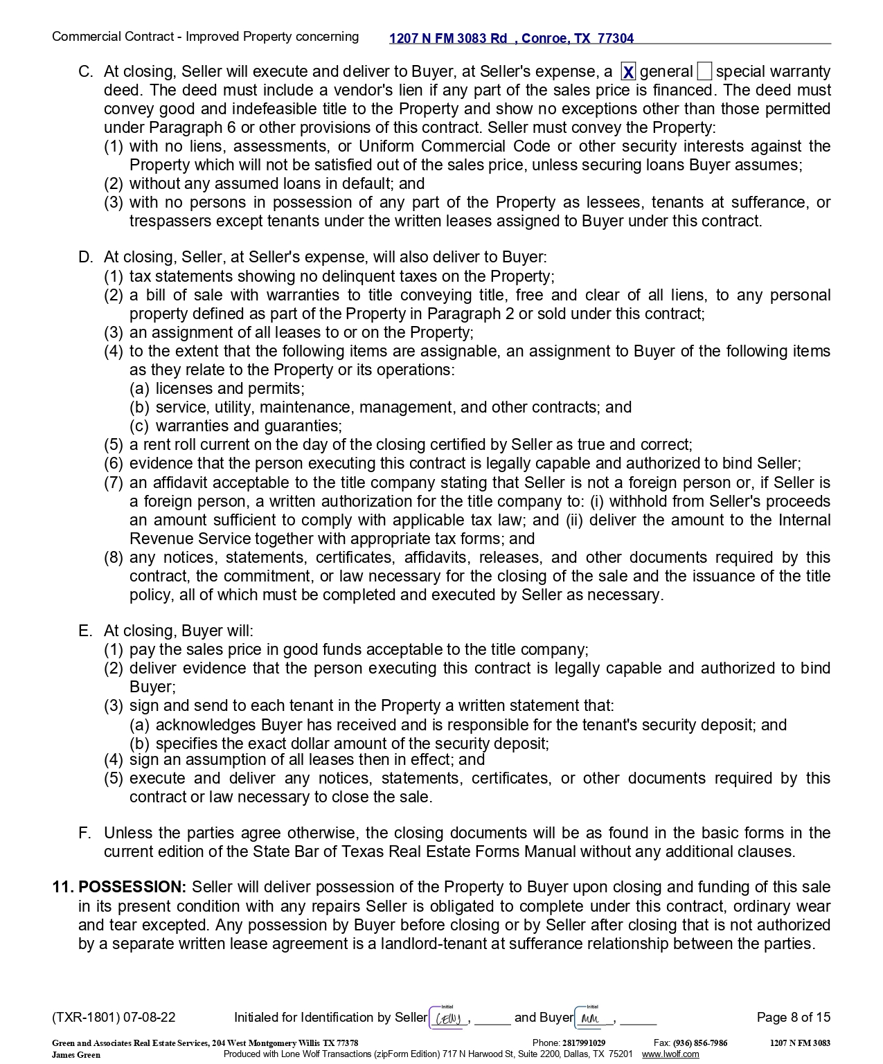 Commercial Contract - Improved Property concerning C. At closing, Seller will execute and deliver to Buyer, at Seller's expense, a X general special warranty deed . The deed must include a vendor's lien if any part of the sales price is financed . The deed must convey good and indefeasible title to the Property and show no exceptions other than those permitted under Paragraph 6 or other provisions of this contract . Seller must convey the Property : (1) with no liens, assessments, or Uniform Commercial Code or other security interests against the Property which will not be satisfied out of the sales price, unless securing loans Buyer assumes ; (2) without any assumed loans in default ; and (3) with no persons in possession of any part of the Property as lessees, tenants at sufferance, or trespassers except tenants under the written leases assigned to Buyer under this contract . D. At closing, Seller, at Seller's expense, will also deliver to Buyer: (1) tax statements showing no delinquent taxes on the Property; (2) a bill of sale with warranties to title conveying title, free and clear of all liens, to any personal property defined as part of the Property in Paragraph 2 or sold under this contract; (3) an assignment of all leases to or on the Property; (4) to the extent that the following items are assignable, an assignment to Buyer of the following items as they relate to the Property or its operations: (a) licenses and permits; (b) service, utility, maintenance, management, and other contracts; and (c) warranties and guaranties; (5) a rent roll current on the day of the closing certified by Seller as true and correct; (6) evidence that the person executing this contract is legally capable and authorized to bind Seller; (7) an affidavit acceptable to the title company stating that Seller is not a foreign person or, if Seller is a foreign person, a written authorization for the title company to : (i) withhold from Seller's proceeds an amount sufficient to comply with applicable tax law ; and (ii) deliver the amount to the Internal Revenue Service together with appropriate tax forms ; and (8) any notices, statements, certificates, affidavits, releases, and other documents required by this contract, the commitment, or law necessary for the closing of the sale and the issuance of the title policy, all of which must be completed and executed by Seller as necessary . E. At closing, Buyer will: (1) pay the sales price in good funds acceptable to the title company; (2) deliver evidence that the person executing this contract is legally capable and authorized to bind Buyer; (3) sign and send to each tenant in the Property a written statement that: (a) acknowledges Buyer has received and is responsible for the tenant's security deposit; and (b) specifies the exact dollar amount of the security deposit; (4) sign an assumption of all leases then in effect; and (5) execute and deliver any notices, statements, certificates, or other documents required by this contract or law necessary to close the sale. F. Unless the parties agree otherwise, the closing documents will be as found in the basic forms in the current edition of the State Bar of Texas Real Estate Forms Manual without any additional clauses . 11 . POSSESSION : Seller will deliver possession of the Property to Buyer upon closing and funding of this sale in its present condition with any repairs Seller is obligated to complete under this contract, ordinary wear and tear excepted . Any possession by Buyer before closing or by Seller after closing that is not authorized by a separate written lease agreement is a landlord - tenant at sufferance relationship between the parties . 1207 N FM 3083 Rd , Conroe, TX 77304 (TXR - 1801) 07 - 08 - 22 Initialed for Identification by Seller , and Buyer , Page 8 of 15 Phone: 2817991029 Fax: (936) 856 - 7986 Green and Associates Real Estate Services, 204 West Montgomery Willis TX 77378 1207 N FM 3083 James Green Produced with Lone Wolf Transactions (zipForm Edition) 717 N Harwood St, Suite 2200, Dallas, TX 75201 www.lwolf.com