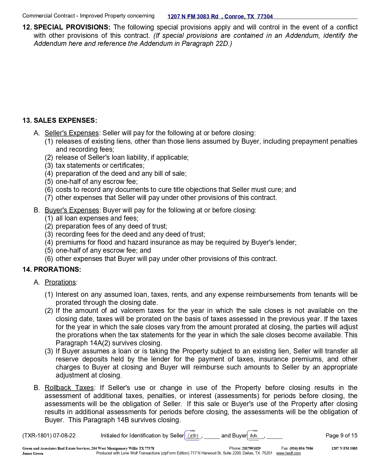 Commercial Contract - Improved Property concerning 12 . SPECIAL PROVISIONS : The following special provisions apply and will control in the event of a conflict with other provisions of this contract . (If special provisions are contained in an Addendum, identify the Addendum here and reference the Addendum in Paragraph 22 D . ) 13. SALES EXPENSES: A. Seller's Expenses : Seller will pay for the following at or before closing: (1) releases of existing liens, other than those liens assumed by Buyer, including prepayment penalties and recording fees; (2) release of Seller's loan liability, if applicable; (3) tax statements or certificates; (4) preparation of the deed and any bill of sale; (5) one - half of any escrow fee; (6) costs to record any documents to cure title objections that Seller must cure; and (7) other expenses that Seller will pay under other provisions of this contract. B. Buyer's Expenses : Buyer will pay for the following at or before closing: (1) all loan expenses and fees; (2) preparation fees of any deed of trust; (3) recording fees for the deed and any deed of trust; (4) premiums for flood and hazard insurance as may be required by Buyer's lender; (5) one - half of any escrow fee; and (6) other expenses that Buyer will pay under other provisions of this contract. 14. PRORATIONS: A. Prorations : (1) Interest on any assumed loan, taxes, rents, and any expense reimbursements from tenants will be prorated through the closing date . (2) If the amount of ad valorem taxes for the year in which the sale closes is not available on the closing date, taxes will be prorated on the basis of taxes assessed in the previous year . If the taxes for the year in which the sale closes vary from the amount prorated at closing, the parties will adjust the prorations when the tax statements for the year in which the sale closes become available . This Paragraph 14 A( 2 ) survives closing . (3) If Buyer assumes a loan or is taking the Property subject to an existing lien, Seller will transfer all reserve deposits held by the lender for the payment of taxes, insurance premiums, and other charges to Buyer at closing and Buyer will reimburse such amounts to Seller by an appropriate adjustment at closing . B. Rollback Taxes : If Seller's use or change in use of the Property before closing results in the assessment of additional taxes, penalties, or interest (assessments) for periods before closing, the assessments will be the obligation of Seller . If this sale or Buyer's use of the Property after closing results in additional assessments for periods before closing, the assessments will be the obligation of Buyer . This Paragraph 14 B survives closing . 1207 N FM 3083 Rd , Conroe, TX 77304 (TXR - 1801) 07 - 08 - 22 Initialed for Identification by Seller , and Buyer , Page 9 of 15 Green and Associates Real Estate Services, 204 West Montgomery Willis TX 77378 Phone: 2817991029 Fax: (936) 856 - 7986 1207 N FM 3083 James Green Produced with Lone Wolf Transactions (zipForm Edition) 717 N Harwood St, Suite 2200, Dallas, TX 75201 www.lwolf.com
