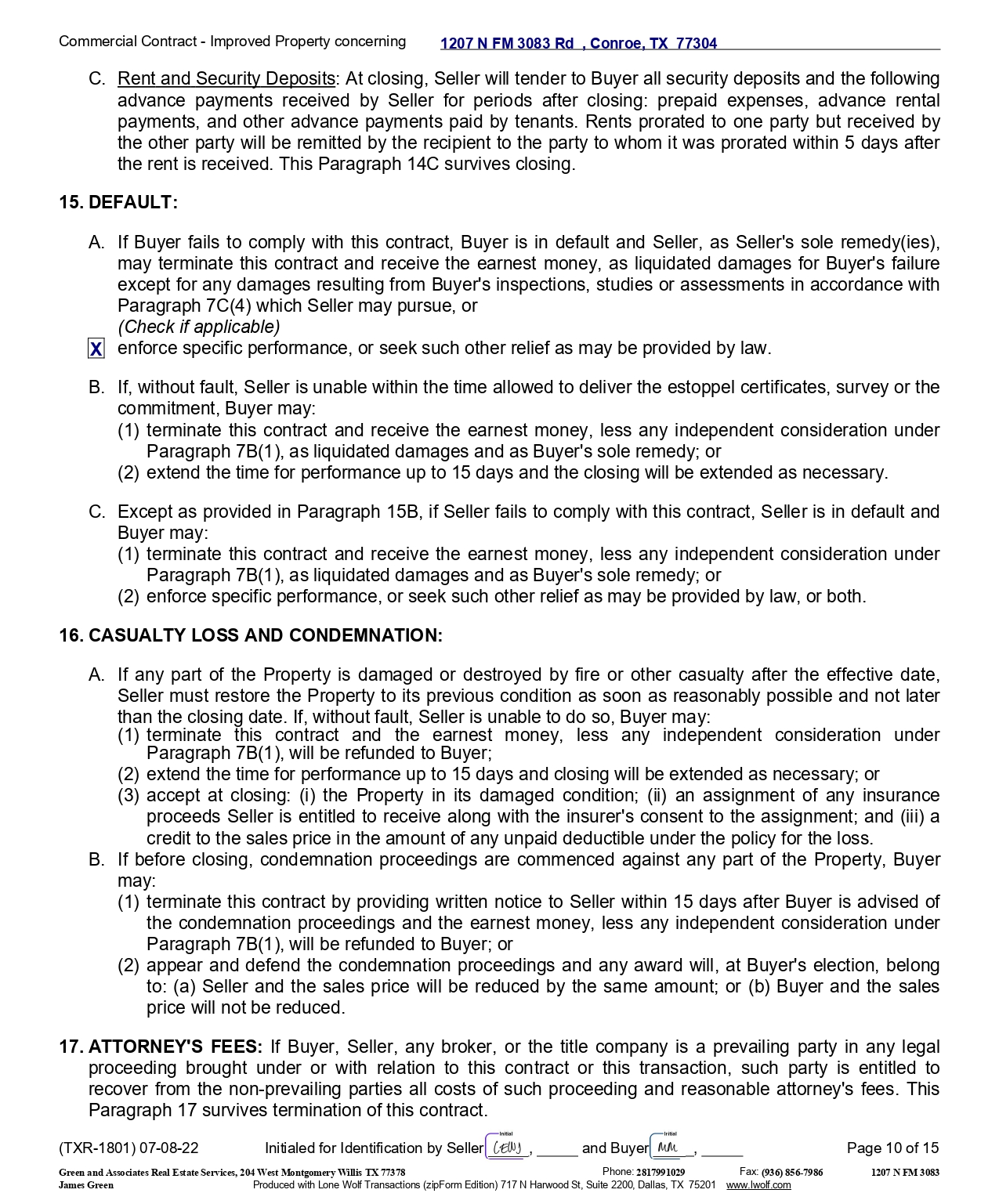 Commercial Contract - Improved Property concerning C . Rent and Security Deposits : At closing, Seller will tender to Buyer all security deposits and the following advance payments received by Seller for periods after closing : prepaid expenses, advance rental payments, and other advance payments paid by tenants . Rents prorated to one party but received by the other party will be remitted by the recipient to the party to whom it was prorated within 5 days after the rent is received . This Paragraph 14 C survives closing . 15. DEFAULT: A . If Buyer fails to comply with this contract, Buyer is in default and Seller, as Seller's sole remedy(ies), may terminate this contract and receive the earnest money, as liquidated damages for Buyer's failure except for any damages resulting from Buyer's inspections, studies or assessments in accordance with Paragraph 7 C( 4 ) which Seller may pursue, or (Check if applicable) enforce specific performance, or seek such other relief as may be provided by law. B. If, without fault, Seller is unable within the time allowed to deliver the estoppel certificates, survey or the commitment, Buyer may: (1) terminate this contract and receive the earnest money, less any independent consideration under Paragraph 7B(1), as liquidated damages and as Buyer's sole remedy; or (2) extend the time for performance up to 15 days and the closing will be extended as necessary. C. Except as provided in Paragraph 15B, if Seller fails to comply with this contract, Seller is in default and Buyer may: (1) terminate this contract and receive the earnest money, less any independent consideration under Paragraph 7B(1), as liquidated damages and as Buyer's sole remedy; or (2) enforce specific performance, or seek such other relief as may be provided by law, or both. 16. CASUALTY LOSS AND CONDEMNATION: A. If any part of the Property is damaged or destroyed by fire or other casualty after the effective date, Seller must restore the Property to its previous condition as soon as reasonably possible and not later than the closing date . If, without fault, Seller is unable to do so, Buyer may : (1) terminate this contract and the earnest money, less any independent consideration under Paragraph 7 B( 1 ), will be refunded to Buyer ; (2) extend the time for performance up to 15 days and closing will be extended as necessary ; or (3) accept at closing : (i) the Property in its damaged condition ; (ii) an assignment of any insurance proceeds Seller is entitled to receive along with the insurer's consent to the assignment ; and (iii) a credit to the sales price in the amount of any unpaid deductible under the policy for the loss . B. If before closing, condemnation proceedings are commenced against any part of the Property, Buyer may : (1) terminate this contract by providing written notice to Seller within 15 days after Buyer is advised of the condemnation proceedings and the earnest money, less any independent consideration under Paragraph 7B(1), will be refunded to Buyer; or (2) appear and defend the condemnation proceedings and any award will, at Buyer's election, belong to: (a) Seller and the sales price will be reduced by the same amount; or (b) Buyer and the sales price will not be reduced. 17 . ATTORNEY'S FEES : If Buyer, Seller, any broker, or the title company is a prevailing party in any legal proceeding brought under or with relation to this contract or this transaction, such party is entitled to recover from the non - prevailing parties all costs of such proceeding and reasonable attorney's fees . This Paragraph 17 survives termination of this contract . 1207 N FM 3083 Rd , Conroe, TX 77304 X (TXR - 1801) 07 - 08 - 22 Initialed for Identification by Seller , and Buyer , Page 10 of 15 1207 N FM 3083 Green and Associates Real Estate Services, 204 West Montgomery Willis TX 77378 Phone: 2817991029 Fax: (936) 856 - 7986 James Green Produced with Lone Wolf Transactions (zipForm Edition) 717 N Harwood St, Suite 2200, Dallas, TX 75201 www.lwolf.com