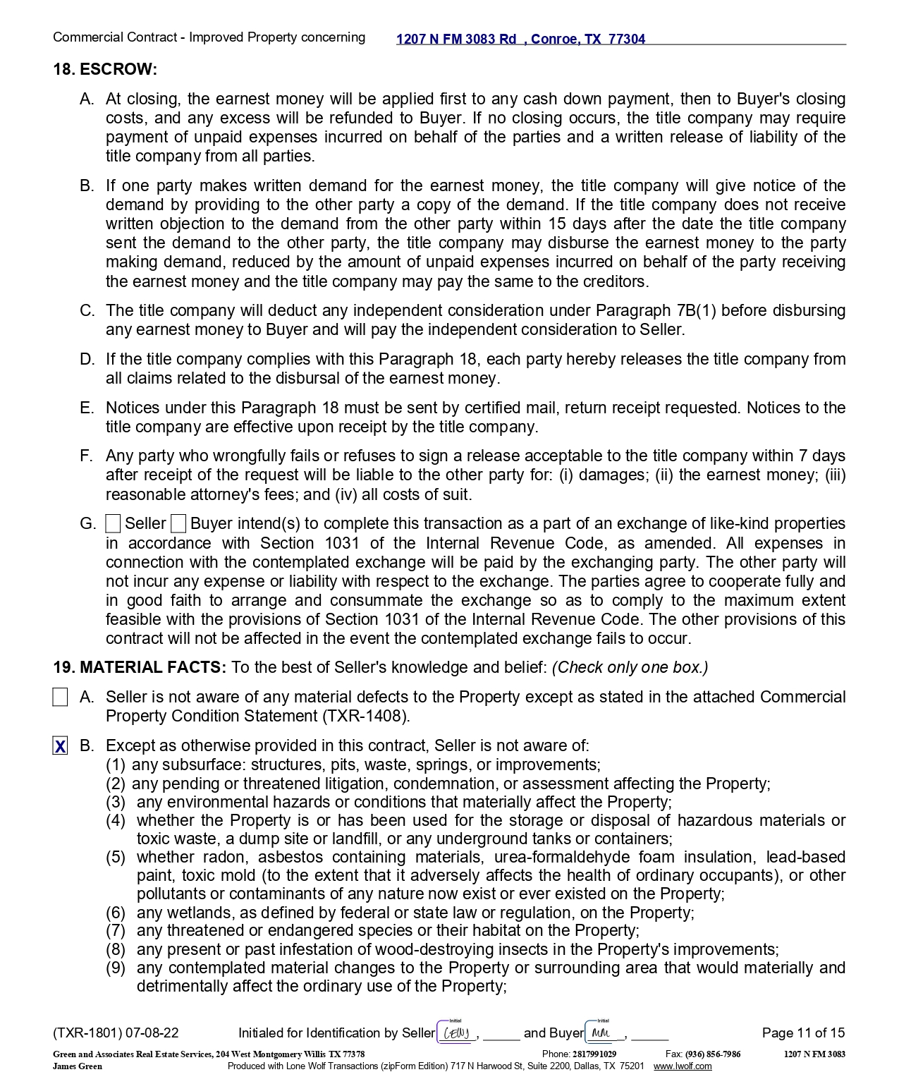Commercial Contract - Improved Property concerning 18. ESCROW : A. At closing, the earnest money will be applied first to any cash down payment, then to Buyer's closing costs, and any excess will be refunded to Buyer . If no closing occurs, the title company may require payment of unpaid expenses incurred on behalf of the parties and a written release of liability of the title company from all parties . B. If one party makes written demand for the earnest money, the title company will give notice of the demand by providing to the other party a copy of the demand . If the title company does not receive written objection to the demand from the other party within 15 days after the date the title company sent the demand to the other party, the title company may disburse the earnest money to the party making demand, reduced by the amount of unpaid expenses incurred on behalf of the party receiving the earnest money and the title company may pay the same to the creditors . C. The title company will deduct any independent consideration under Paragraph 7 B( 1 ) before disbursing any earnest money to Buyer and will pay the independent consideration to Seller . D. If the title company complies with this Paragraph 18 , each party hereby releases the title company from all claims related to the disbursal of the earnest money . E. Notices under this Paragraph 18 must be sent by certified mail, return receipt requested . Notices to the title company are effective upon receipt by the title company . F. Any party who wrongfully fails or refuses to sign a release acceptable to the title company within 7 days after receipt of the request will be liable to the other party for : (i) damages ; (ii) the earnest money ; (iii) reasonable attorney's fees ; and (iv) all costs of suit . G. Seller Buyer intend(s) to complete this transaction as a part of an exchange of like - kind properties in accordance with Section 1031 of the Internal Revenue Code, as amended . All expenses in connection with the contemplated exchange will be paid by the exchanging party . The other party will not incur any expense or liability with respect to the exchange . The parties agree to cooperate fully and in good faith to arrange and consummate the exchange so as to comply to the maximum extent feasible with the provisions of Section 1031 of the Internal Revenue Code . The other provisions of this contract will not be affected in the event the contemplated exchange fails to occur . 19. MATERIAL FACTS : To the best of Seller's knowledge and belief : (Check only one box . ) A. Seller is not aware of any material defects to the Property except as stated in the attached Commercial Property Condition Statement (TXR - 1408). B. Except as otherwise provided in this contract, Seller is not aware of: (1) any subsurface: structures, pits, waste, springs, or improvements; (2) any pending or threatened litigation, condemnation, or assessment affecting the Property; (3) any environmental hazards or conditions that materially affect the Property; (4) whether the Property is or has been used for the storage or disposal of hazardous materials or toxic waste, a dump site or landfill, or any underground tanks or containers; (5) whether radon, asbestos containing materials, urea - formaldehyde foam insulation, lead - based paint, toxic mold (to the extent that it adversely affects the health of ordinary occupants), or other pollutants or contaminants of any nature now exist or ever existed on the Property; (6) any wetlands, as defined by federal or state law or regulation, on the Property; (7) any threatened or endangered species or their habitat on the Property; (8) any present or past infestation of wood - destroying insects in the Property's improvements; (9) any contemplated material changes to the Property or surrounding area that would materially and detrimentally affect the ordinary use of the Property; 1207 N FM 3083 Rd , Conroe, TX 77304 X (TXR - 1801) 07 - 08 - 22 Initialed for Identification by Seller , and Buyer , Page 11 of 15 1207 N FM 3083 Green and Associates Real Estate Services, 204 West Montgomery Willis TX 77378 Phone: 2817991029 Fax: (936) 856 - 7986 James Green Produced with Lone Wolf Transactions (zipForm Edition) 717 N Harwood St, Suite 2200, Dallas, TX 75201 www.lwolf.com