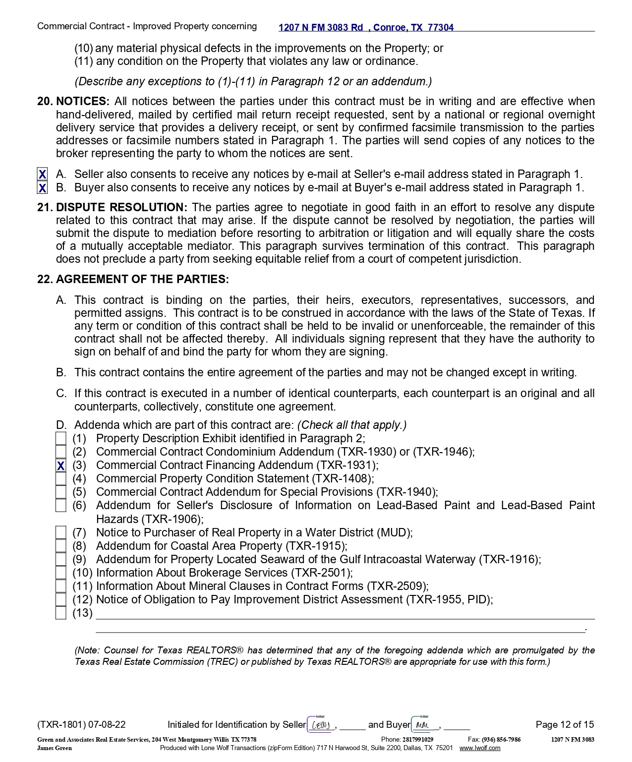Commercial Contract - Improved Property concerning (10) any material physical defects in the improvements on the Property; or (11) any condition on the Property that violates any law or ordinance. (Describe any exceptions to (1) - (11) in Paragraph 12 or an addendum.) 20 . NOTICES : All notices between the parties under this contract must be in writing and are effective when hand - delivered, mailed by certified mail return receipt requested, sent by a national or regional overnight delivery service that provides a delivery receipt, or sent by confirmed facsimile transmission to the parties addresses or facsimile numbers stated in Paragraph 1 . The parties will send copies of any notices to the broker representing the party to whom the notices are sent . A. Seller also consents to receive any notices by e - mail at Seller's e - mail address stated in Paragraph 1. B. Buyer also consents to receive any notices by e - mail at Buyer's e - mail address stated in Paragraph 1. 21. DISPUTE RESOLUTION : The parties agree to negotiate in good faith in an effort to resolve any dispute related to this contract that may arise . If the dispute cannot be resolved by negotiation, the parties will submit the dispute to mediation before resorting to arbitration or litigation and will equally share the costs of a mutually acceptable mediator . This paragraph survives termination of this contract . This paragraph does not preclude a party from seeking equitable relief from a court of competent jurisdiction . 22. AGREEMENT OF THE PARTIES: A. This contract is binding on the parties, their heirs, executors, representatives, successors, and permitted assigns . This contract is to be construed in accordance with the laws of the State of Texas . If any term or condition of this contract shall be held to be invalid or unenforceable, the remainder of this contract shall not be affected thereby . All individuals signing represent that they have the authority to sign on behalf of and bind the party for whom they are signing . B. This contract contains the entire agreement of the parties and may not be changed except in writing. C. If this contract is executed in a number of identical counterparts, each counterpart is an original and all counterparts, collectively, constitute one agreement. D. Addenda which are part of this contract are: (Check all that apply.) (1) Property Description Exhibit identified in Paragraph 2; (2) Commercial Contract Condominium Addendum (TXR - 1930) or (TXR - 1946); (3) Commercial Contract Financing Addendum (TXR - 1931); (4) Commercial Property Condition Statement (TXR - 1408); (5) Commercial Contract Addendum for Special Provisions (TXR - 1940); (6) Addendum for Seller's Disclosure of Information on Lead - Based Paint and Lead - Based Paint Hazards (TXR - 1906); (7) Notice to Purchaser of Real Property in a Water District (MUD); (8) Addendum for Coastal Area Property (TXR - 1915); (9) Addendum for Property Located Seaward of the Gulf Intracoastal Waterway (TXR - 1916); (10) Information About Brokerage Services (TXR - 2501); (11) Information About Mineral Clauses in Contract Forms (TXR - 2509); (12) Notice of Obligation to Pay Improvement District Assessment (TXR - 1955, PID); (13) . (Note: Counsel for Texas REALTORS® has determined that any of the foregoing addenda which are promulgated by the Texas Real Estate Commission (TREC) or published by Texas REALTORS® are appropriate for use with this form.) X 1207 N FM 3083 Rd , Conroe, TX 77304 X X (TXR - 1801) 07 - 08 - 22 Initialed for Identification by Seller , and Buyer , Page 12 of 15 1207 N FM 3083 Green and Associates Real Estate Services, 204 West Montgomery Willis TX 77378 Phone: 2817991029 Fax: (936) 856 - 7986 James Green Produced with Lone Wolf Transactions (zipForm Edition) 717 N Harwood St, Suite 2200, Dallas, TX 75201 www.lwolf.com
