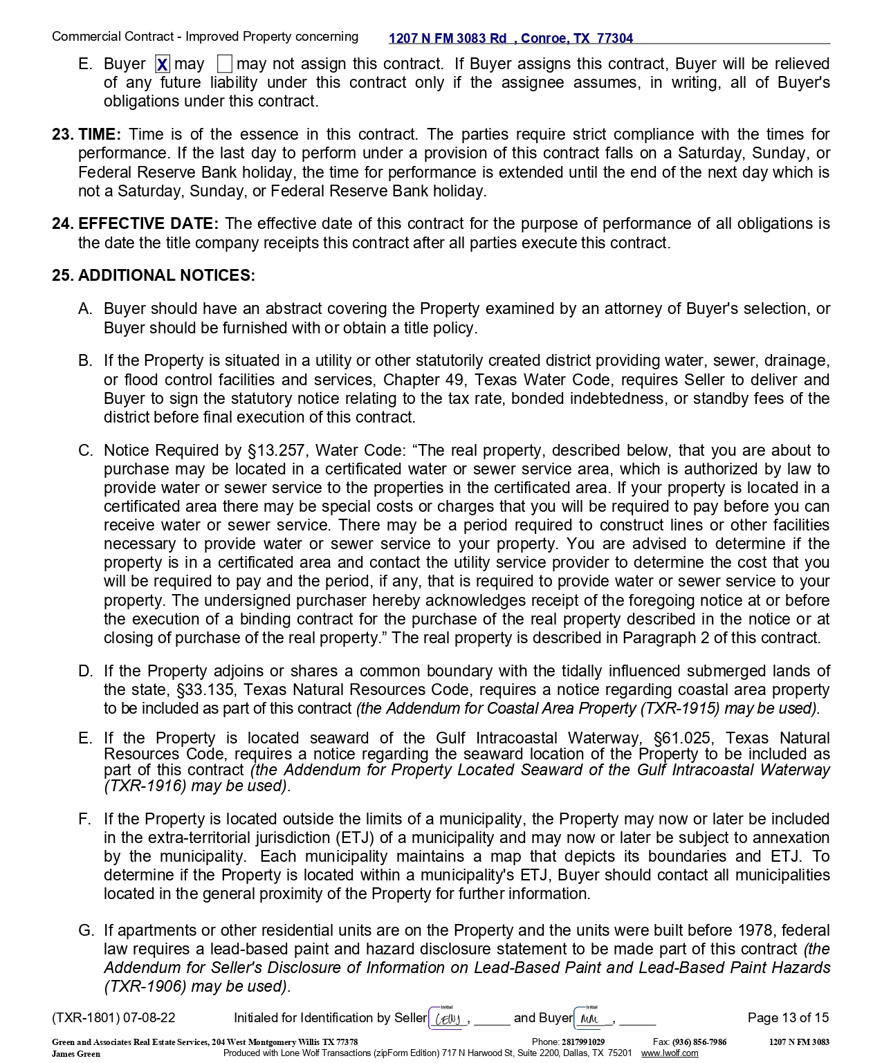 Commercial Contract - Improved Property concerning E . Buyer X may may not assign this contract . If Buyer assigns this contract, Buyer will be relieved of any future liability under this contract only if the assignee assumes, in writing, all of Buyer's obligations under this contract . 23. TIME : Time is of the essence in this contract . The parties require strict compliance with the times for performance . If the last day to perform under a provision of this contract falls on a Saturday, Sunday, or Federal Reserve Bank holiday, the time for performance is extended until the end of the next day which is not a Saturday, Sunday, or Federal Reserve Bank holiday . 24. EFFECTIVE DATE : The effective date of this contract for the purpose of performance of all obligations is the date the title company receipts this contract after all parties execute this contract . 25. ADDITIONAL NOTICES: A. Buyer should have an abstract covering the Property examined by an attorney of Buyer's selection, or Buyer should be furnished with or obtain a title policy . B. If the Property is situated in a utility or other statutorily created district providing water, sewer, drainage, or flood control facilities and services, Chapter 49 , Texas Water Code, requires Seller to deliver and Buyer to sign the statutory notice relating to the tax rate, bonded indebtedness, or standby fees of the district before final execution of this contract . C. Notice Required by 13 . 257 , Water Code : “The real property, described below, that you are about to purchase may be located in a certificated water or sewer service area, which is authorized by law to provide water or sewer service to the properties in the certificated area . If your property is located in a certificated area there may be special costs or charges that you will be required to pay before you can receive water or sewer service . There may be a period required to construct lines or other facilities necessary to provide water or sewer service to your property . You are advised to determine if the property is in a certificated area and contact the utility service provider to determine the cost that you will be required to pay and the period, if any, that is required to provide water or sewer service to your property . The undersigned purchaser hereby acknowledges receipt of the foregoing notice at or before the execution of a binding contract for the purchase of the real property described in the notice or at closing of purchase of the real property . ” The real property is described in Paragraph 2 of this contract . D. If the Property adjoins or shares a common boundary with the tidally influenced submerged lands of the state, 33 . 135 , Texas Natural Resources Code, requires a notice regarding coastal area property to be included as part of this contract (the Addendum for Coastal Area Property (TXR - 1915 ) may be used) . E. If the Property is located seaward of the Gulf Intracoastal Waterway, 61 . 025 , Texas Natural Resources Code, requires a notice regarding the seaward location of the Property to be included as part of this contract (the Addendum for Property Located Seaward of the Gulf Intracoastal Waterway (TXR - 1916 ) may be used) . F. If the Property is located outside the limits of a municipality, the Property may now or later be included in the extra - territorial jurisdiction (ETJ) of a municipality and may now or later be subject to annexation by the municipality . Each municipality maintains a map that depicts its boundaries and ETJ . To determine if the Property is located within a municipality's ETJ, Buyer should contact all municipalities located in the general proximity of the Property for further information . G. If apartments or other residential units are on the Property and the units were built before 1978 , federal law requires a lead - based paint and hazard disclosure statement to be made part of this contract (the Addendum for Seller's Disclosure of Information on Lead - Based Paint and Lead - Based Paint Hazards (TXR - 1906 ) may be used) . (TXR - 1801) 07 - 08 - 22 Initialed for Identification by Seller , and Buyer , Page 13 of 15 1207 N FM 3083 Rd , Conroe, TX 77304 Phone: 2817991029 Fax: (936) 856 - 7986 Green and Associates Real Estate Services, 204 West Montgomery Willis TX 77378 1207 N FM 3083 James Green Produced with Lone Wolf Transactions (zipForm Edition) 717 N Harwood St, Suite 2200, Dallas, TX 75201 www.lwolf.com