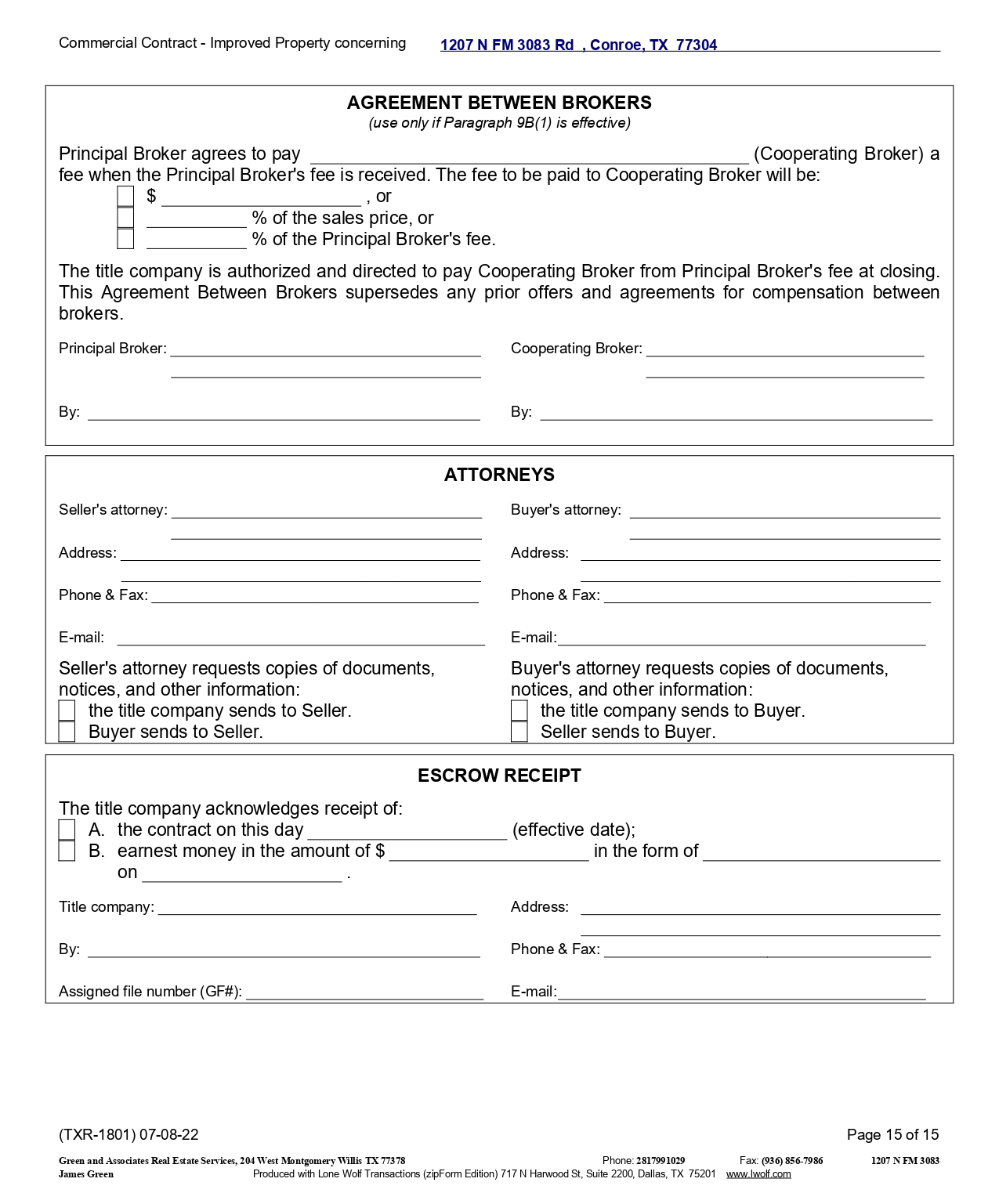 ATTORNEYS Seller's attorney: Buyer's attorney: Address: Address: Phone & Fax: Phone & Fax: E - mail: E - mail: Seller's attorney requests copies of documents, Buyer's attorney requests copies of documents, notices, and other information: notices, and other information: the title company sends to Buyer. Seller sends to Buyer. the title company sends to Seller. Buyer sends to Seller. Commercial Contract - Improved Property concerning (TXR - 1801) 07 - 08 - 22 Green and Associates Real Estate Services, 204 West Montgomery Willis TX 77378 Page 15 of 15 1207 N FM 3083 Phone: 2817991029 Fax: (936) 856 - 7986 James Green Produced with Lone Wolf Transactions (zipForm Edition) 717 N Harwood St, Suite 2200, Dallas, TX 75201 www.lwolf.com AGREEMENT BETWEEN BROKERS (use only if Paragraph 9B(1) is effective) Principal Broker agrees to pay (Cooperating Broker) a fee when the Principal Broker's fee is received. The fee to be paid to Cooperating Broker will be: $ , or % of the sales price, or % of the Principal Broker's fee. The title company is authorized and directed to pay Cooperating Broker from Principal Broker's fee at closing . This Agreement Between Brokers supersedes any prior offers and agreements for compensation between brokers . Principal Broker : Cooperating Broker : By : By : ESCROW RECEIPT The title company acknowledges receipt of: A. the contract on this day (effective date); B. earnest money in the amount of $ in the form of on . Title company: Address: By: Phone & Fax: Assigned file number (GF#): E - mail: 1207 N FM 3083 Rd , Conroe, TX 77304