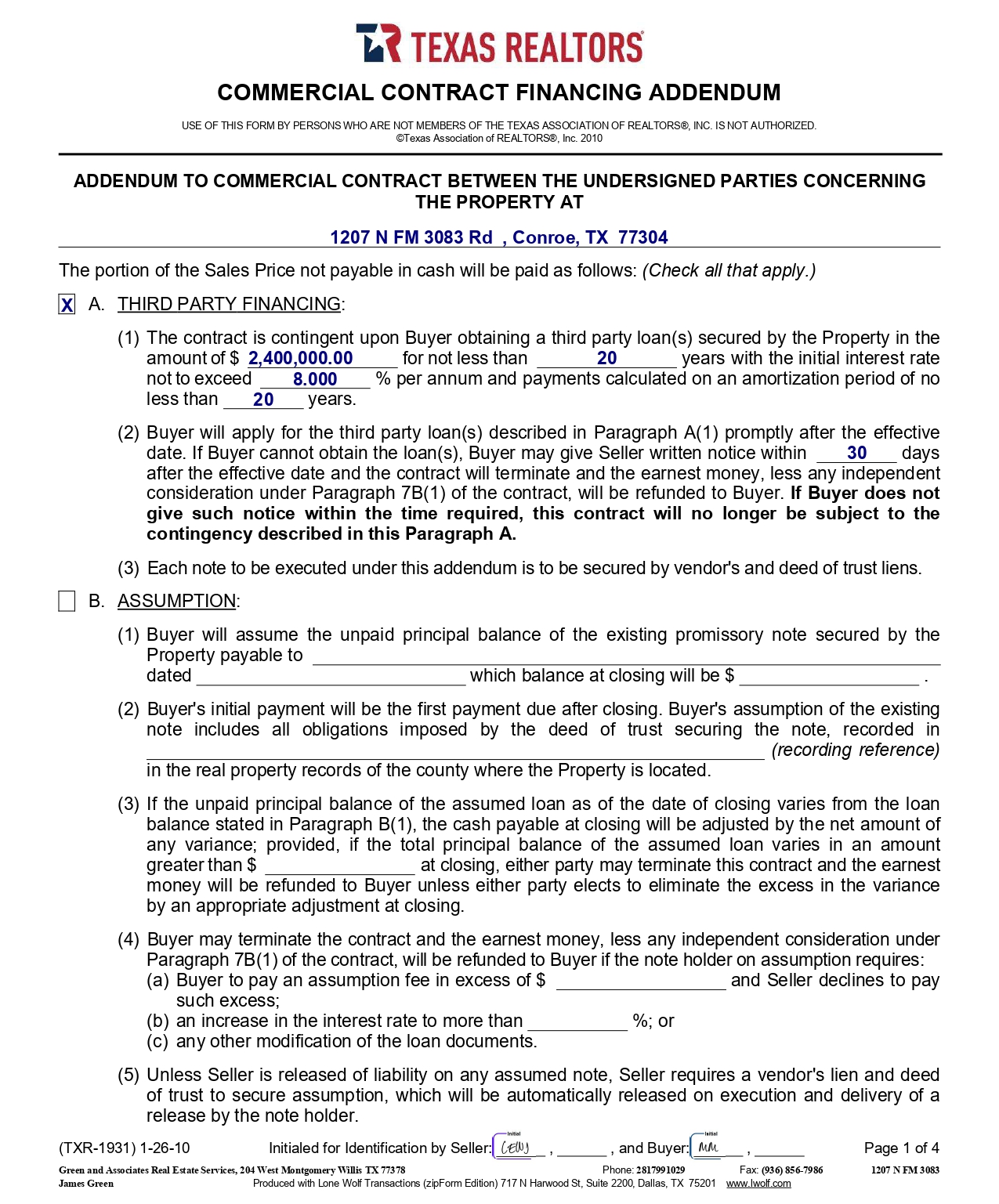 COMMERCIAL CONTRACT FINANCING ADDENDUM USE OF THIS FORM BY PERSONS WHO ARE NOT MEMBERS OF THE TEXAS ASSOCIATION OF REALTORS®, INC. IS NOT AUTHORIZED. ©Texas Association of REALTORS®, Inc. 2010 ADDENDUM TO COMMERCIAL CONTRACT BETWEEN THE UNDERSIGNED PARTIES CONCERNING THE PROPERTY AT 1207 N FM 3083 Rd , Conroe, TX 77304 The portion of the Sales Price not payable in cash will be paid as follows: (Check all that apply.) X A. THIRD PARTY FINANCING : (1) The contract is contingent upon Buyer obtaining a third party loan(s) secured by the Property in the amount of $ 2 , 400 , 000 . 00 for not less than 20 years with the initial interest rate not to exceed 8 . 000 % per annum and payments calculated on an amortization period of no less than 20 years . (2) Buyer will apply for the third party loan(s) described in Paragraph A( 1 ) promptly after the effective date . If Buyer cannot obtain the loan(s), Buyer may give Seller written notice within 30 days after the effective date and the contract will terminate and the earnest money, less any independent consideration under Paragraph 7 B( 1 ) of the contract, will be refunded to Buyer . If Buyer does not give such notice within the time required, this contract will no longer be subject to the contingency described in this Paragraph A . (3) Each note to be executed under this addendum is to be secured by vendor's and deed of trust liens. B. ASSUMPTION : (1) Buyer will assume the unpaid principal balance of the existing promissory note secured by the Property payable to dated which balance at closing will be $ . (2) Buyer's initial payment will be the first payment due after closing. Buyer's assumption of the existing note includes all obligations imposed by the deed of trust securing the note, recorded in (recording reference) in the real property records of the county where the Property is located. (3) If the unpaid principal balance of the assumed loan as of the date of closing varies from the loan balance stated in Paragraph B( 1 ), the cash payable at closing will be adjusted by the net amount of any variance ; provided, if the total principal balance of the assumed loan varies in an amount greater than $ at closing, either party may terminate this contract and the earnest money will be refunded to Buyer unless either party elects to eliminate the excess in the variance by an appropriate adjustment at closing . (4) Buyer may terminate the contract and the earnest money, less any independent consideration under Paragraph 7B(1) of the contract, will be refunded to Buyer if the note holder on assumption requires: (a) Buyer to pay an assumption fee in excess of $ and Seller declines to pay such excess; (b) an increase in the interest rate to more than %; or (c) any other modification of the loan documents. (3) Unless Seller is released of liability on any assumed note, Seller requires a vendor's lien and deed of trust to secure assumption, which will be automatically released on execution and delivery of a release by the note holder . (TXR - 1931) 1 - 26 - 10 Initialed for Identification by Seller: , , and Buyer: , Page 1 of 4 1207 N FM 3083 Green and Associates Real Estate Services, 204 West Montgomery Willis TX 77378 Phone: 2817991029 Fax: (936) 856 - 7986 James Green Produced with Lone Wolf Transactions (zipForm Edition) 717 N Harwood St, Suite 2200, Dallas, TX 75201 www.lwolf.com