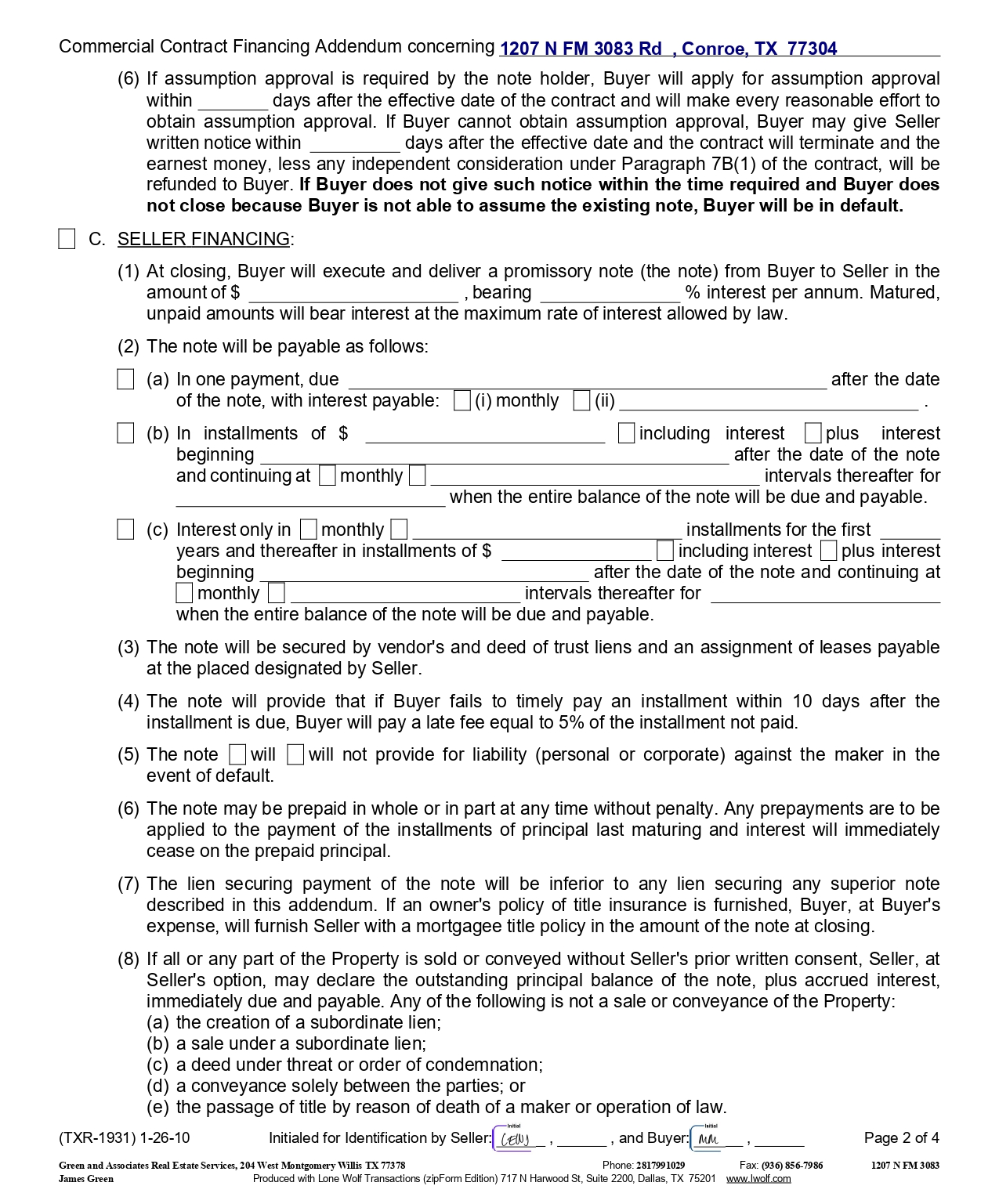 Commercial Contract Financing Addendum concerning 1207 N FM 3083 Rd , Conroe, TX 77304 ( 6 ) If assumption approval is required by the note holder, Buyer will apply for assumption approval within days after the effective date of the contract and will make every reasonable effort to obtain assumption approval . If Buyer cannot obtain assumption approval, Buyer may give Seller written notice within days after the effective date and the contract will terminate and the earnest money, less any independent consideration under Paragraph 7 B( 1 ) of the contract, will be refunded to Buyer . If Buyer does not give such notice within the time required and Buyer does not close because Buyer is not able to assume the existing note, Buyer will be in default . C. SELLER FINANCING : (1) At closing, Buyer will execute and deliver a promissory note (the note) from Buyer to Seller in the amount of $ , bearing % interest per annum . Matured, unpaid amounts will bear interest at the maximum rate of interest allowed by law . (2) The note will be payable as follows : (a) In one payment, due after the date of the note, with interest payable : (i) monthly (ii) . (b) In installments of $ including interest plus interest beginning after the date of the note and continuing at monthly intervals thereafter for when the entire balance of the note will be due and payable . (c) Interest only in monthly installments for the first years and thereafter in installments of $ including interest plus interest beginning after the date of the note and continuing at monthly intervals thereafter for when the entire balance of the note will be due and payable . (3) The note will be secured by vendor's and deed of trust liens and an assignment of leases payable at the placed designated by Seller . (4) The note will provide that if Buyer fails to timely pay an installment within 10 days after the installment is due, Buyer will pay a late fee equal to 5 % of the installment not paid . (5) The note will will not provide for liability (personal or corporate) against the maker in the event of default . (6) The note may be prepaid in whole or in part at any time without penalty . Any prepayments are to be applied to the payment of the installments of principal last maturing and interest will immediately cease on the prepaid principal . (7) The lien securing payment of the note will be inferior to any lien securing any superior note described in this addendum . If an owner's policy of title insurance is furnished, Buyer, at Buyer's expense, will furnish Seller with a mortgagee title policy in the amount of the note at closing . (8) If all or any part of the Property is sold or conveyed without Seller's prior written consent, Seller, at Seller's option, may declare the outstanding principal balance of the note, plus accrued interest, immediately due and payable . Any of the following is not a sale or conveyance of the Property : (a) the creation of a subordinate lien; (b) a sale under a subordinate lien; (c) a deed under threat or order of condemnation; (d) a conveyance solely between the parties; or (e) the passage of title by reason of death of a maker or operation of law. (TXR - 1931) 1 - 26 - 10 Initialed for Identification by Seller: , , and Buyer: , Page 2 of 4 Phone: 2817991029 Fax: (936) 856 - 7986 Green and Associates Real Estate Services, 204 West Montgomery Willis TX 77378 1207 N FM 3083 James Green Produced with Lone Wolf Transactions (zipForm Edition) 717 N Harwood St, Suite 2200, Dallas, TX 75201 www.lwolf.com