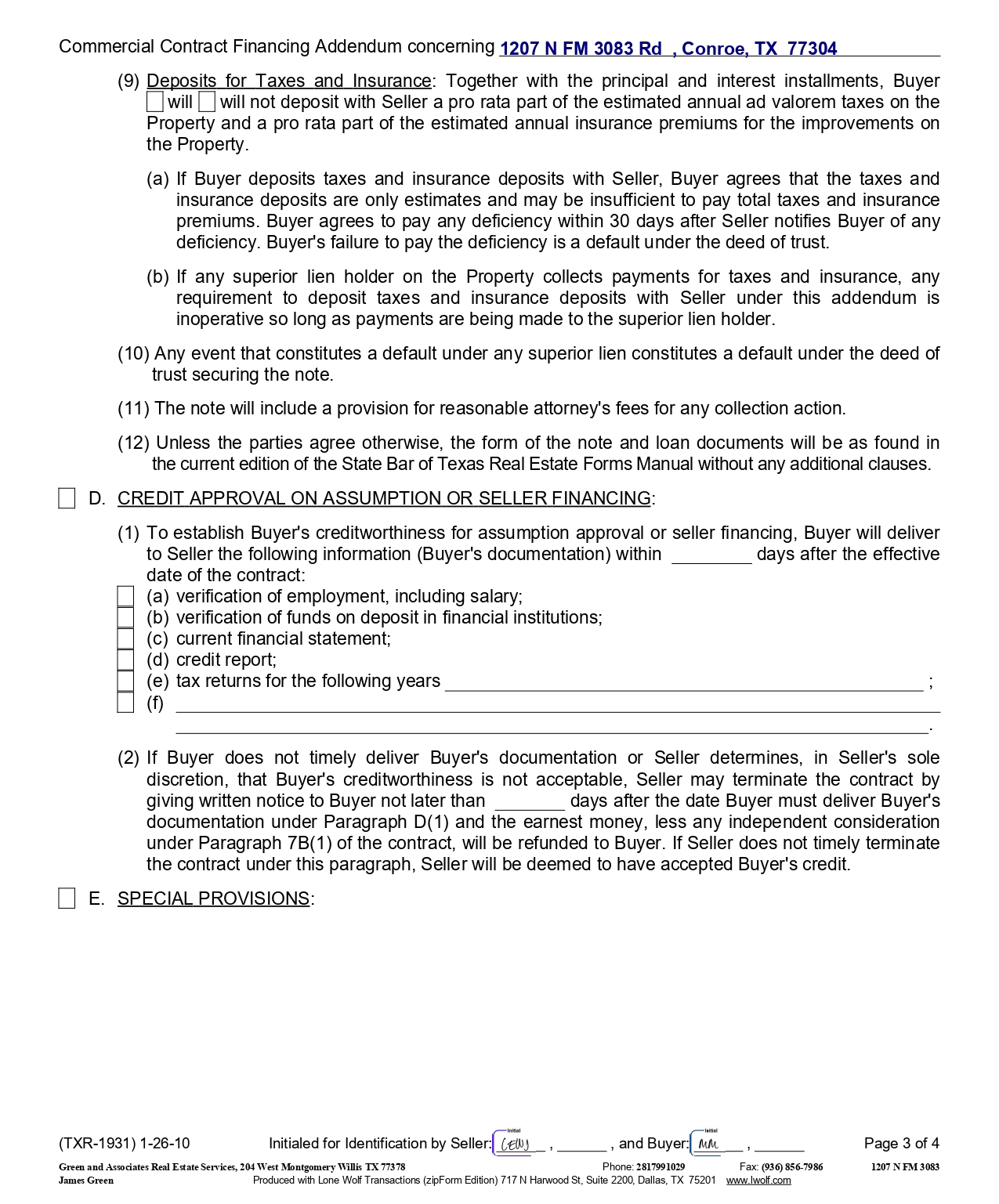 Commercial Contract Financing Addendum concerning 1207 N FM 3083 Rd , Conroe, TX 77304 (9) Deposits for Taxes and Insurance : Together with the principal and interest installments, Buyer will will not deposit with Seller a pro rata part of the estimated annual ad valorem taxes on the Property and a pro rata part of the estimated annual insurance premiums for the improvements on the Property. (a) If Buyer deposits taxes and insurance deposits with Seller, Buyer agrees that the taxes and insurance deposits are only estimates and may be insufficient to pay total taxes and insurance premiums . Buyer agrees to pay any deficiency within 30 days after Seller notifies Buyer of any deficiency . Buyer's failure to pay the deficiency is a default under the deed of trust . (b) If any superior lien holder on the Property collects payments for taxes and insurance, any requirement to deposit taxes and insurance deposits with Seller under this addendum is inoperative so long as payments are being made to the superior lien holder . (10) Any event that constitutes a default under any superior lien constitutes a default under the deed of trust securing the note . (11) The note will include a provision for reasonable attorney's fees for any collection action. (12) Unless the parties agree otherwise, the form of the note and loan documents will be as found in the current edition of the State Bar of Texas Real Estate Forms Manual without any additional clauses . D. CREDIT APPROVAL ON ASSUMPTION OR SELLER FINANCING : (1) To establish Buyer's creditworthiness for assumption approval or seller financing, Buyer will deliver to Seller the following information (Buyer's documentation) within days after the effective date of the contract : (a) verification of employment, including salary; (b) verification of funds on deposit in financial institutions; (c) current financial statement; (d) credit report; (e) tax returns for the following years ; (f) . (2) If Buyer does not timely deliver Buyer's documentation or Seller determines, in Seller's sole discretion, that Buyer's creditworthiness is not acceptable, Seller may terminate the contract by giving written notice to Buyer not later than days after the date Buyer must deliver Buyer's documentation under Paragraph D( 1 ) and the earnest money, less any independent consideration under Paragraph 7 B( 1 ) of the contract, will be refunded to Buyer . If Seller does not timely terminate the contract under this paragraph, Seller will be deemed to have accepted Buyer's credit . E. SPECIAL PROVISIONS : (TXR - 1931) 1 - 26 - 10 Initialed for Identification by Seller: , , and Buyer: , Page 3 of 4 1207 N FM 3083 Green and Associates Real Estate Services, 204 West Montgomery Willis TX 77378 Phone: 2817991029 Fax: (936) 856 - 7986 Produced with Lone Wolf Transactions (zipForm Edition) 717 N Harwood St, Suite 2200, Dallas, TX 75201 www.lwolf.com James Green
