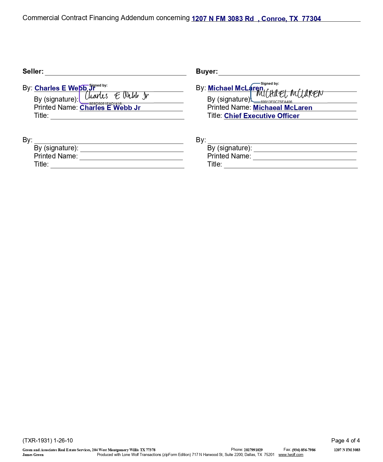 Commercial Contract Financing Addendum concerning 1207 N FM 3083 Rd , Conroe, TX 77304 Seller: By: Charles E Webb Jr By (signature): Printed Name: Charles E Webb Jr Title: By : By (signature) : Printed Name : Title : Buyer: By: Michael McLaren By (signature): Printed Name: Michaeal McLaren Title: Chief Executive Officer By : By (signature) : Printed Name : Title : (TXR - 1931) 1 - 26 - 10 Page 4 of 4 Green and Associates Real Estate Services, 204 West Montgomery Willis TX 77378 Phone: 2817991029 Fax: (936) 856 - 7986 1207 N FM 3083 James Green Produced with Lone Wolf Transactions (zipForm Edition) 717 N Harwood St, Suite 2200, Dallas, TX 75201 www.lwolf.com
