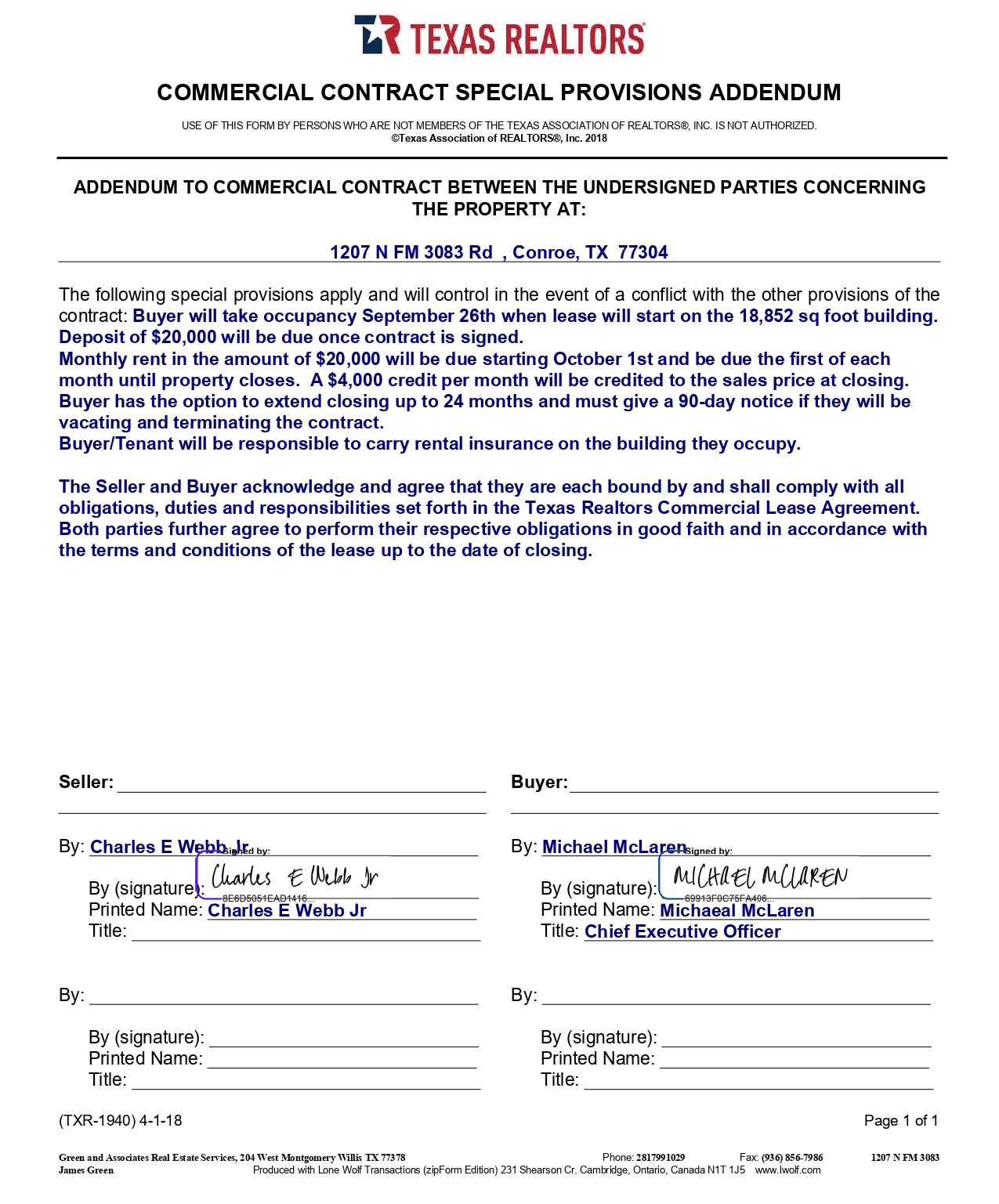 COMMERCIAL CONTRACT SPECIAL PROVISIONS ADDENDUM USE OF THIS FORM BY PERSONS WHO ARE NOT MEMBERS OF THE TEXAS ASSOCIATION OF REALTORS®, INC. IS NOT AUTHORIZED. ©Texas Association of REALTORS®, Inc. 2018 ADDENDUM TO COMMERCIAL CONTRACT BETWEEN THE UNDERSIGNED PARTIES CONCERNING THE PROPERTY AT: 1207 N FM 3083 Rd , Conroe, TX 77304 The following special provisions apply and will control in the event of a conflict with the other provisions of the contract : Buyer will take occupancy September 26 th when lease will start on the 18 , 852 sq foot building . Deposit of $ 20 , 000 will be due once contract is signed . Monthly rent in the amount of $20,000 will be due starting October 1st and be due the first of each month until property closes. A $4,000 credit per month will be credited to the sales price at closing. Buyer has the option to extend closing up to 24 months and must give a 90 - day notice if they will be vacating and terminating the contract. Buyer/Tenant will be responsible to carry rental insurance on the building they occupy. The Seller and Buyer acknowledge and agree that they are each bound by and shall comply with all obligations, duties and responsibilities set forth in the Texas Realtors Commercial Lease Agreement. Both parties further agree to perform their respective obligations in good faith and in accordance with the terms and conditions of the lease up to the date of closing. Seller: By: Charles E Webb Jr By (signature): Printed Name: Charles E Webb Jr Title: By: By (signature) : Printed Name : Title : Buyer: By: Michael McLaren By (signature): Printed Name: Michaeal McLaren Title: Chief Executive Officer By: By (signature) : Printed Name : Title : (TXR - 1940) 4 - 1 - 18 Page 1 of 1 Green and Associates Real Estate Services, 204 West Montgomery Willis TX 77378 Phone: 2817991029 Fax: (936) 856 - 7986 James Green Produced with Lone Wolf Transactions (zipForm Edition) 231 Shearson Cr. Cambridge, Ontario, Canada N1T 1J5 www.lwolf.com 1207 N FM 3083